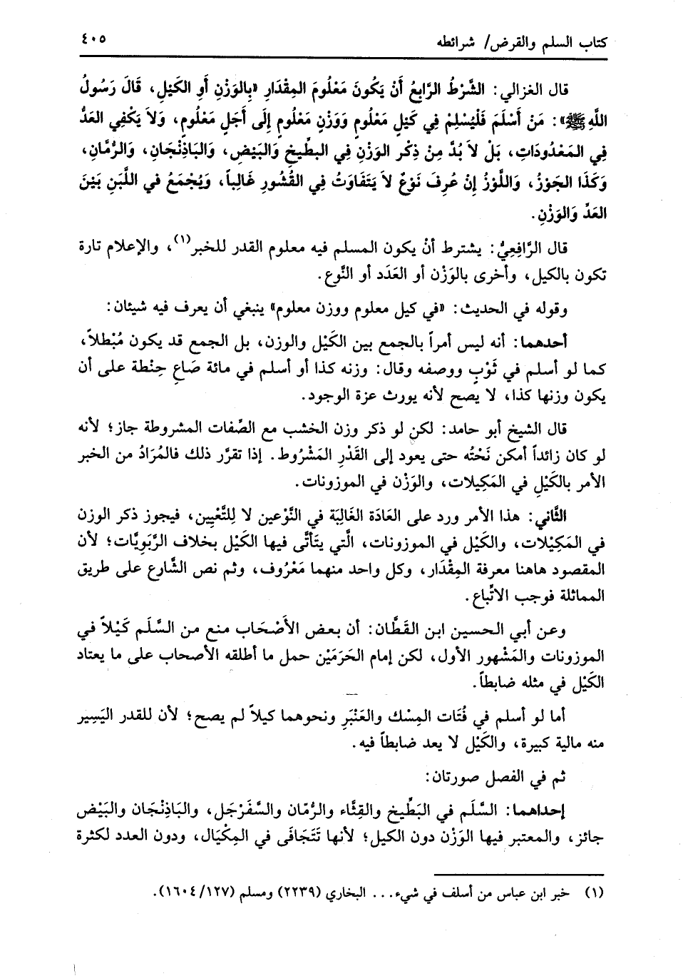قال الغزالي: الشَّرْطُ الرَّابعُ أَنْ يَكُونَ مَعْلُومَ المِقْدَارِا "بِالوَزْنِ أَوِ الكَيْلِ، قَالَ رَسُولُ اللهِ -صلى الله عليه وسلم-": مَنْ أَسْلَمَ فَلْيُسْلِمْ فِي كَيْل مَعْلُومٍ وَوَزْنٍ مَعْلُومٍ إلَى أَجَلٍ مَعْلُومٍ، وَلاَ يَكْفِي العَدُّ فِي المَعْدُودَاتِ، بَلْ لاَ بُدَّ مِنْ ذِكْر الوَزْنِ فِي البطِّيخِ وَالبَيْضِ، وَالبَاذِنْجَانِ، وَالرُّمَّانِ، وَكذَا الجَوْزُ، وَاللَّوْزُ إِنْ عُرِفَ نَوْعٌ لاَ يَتَفَاوَتُ فِي القُشُورِ غَالِباً، وَيُجْمَع في اللَّبَنِ بَيْنَ العَدِّ وَالوَزْنِ.