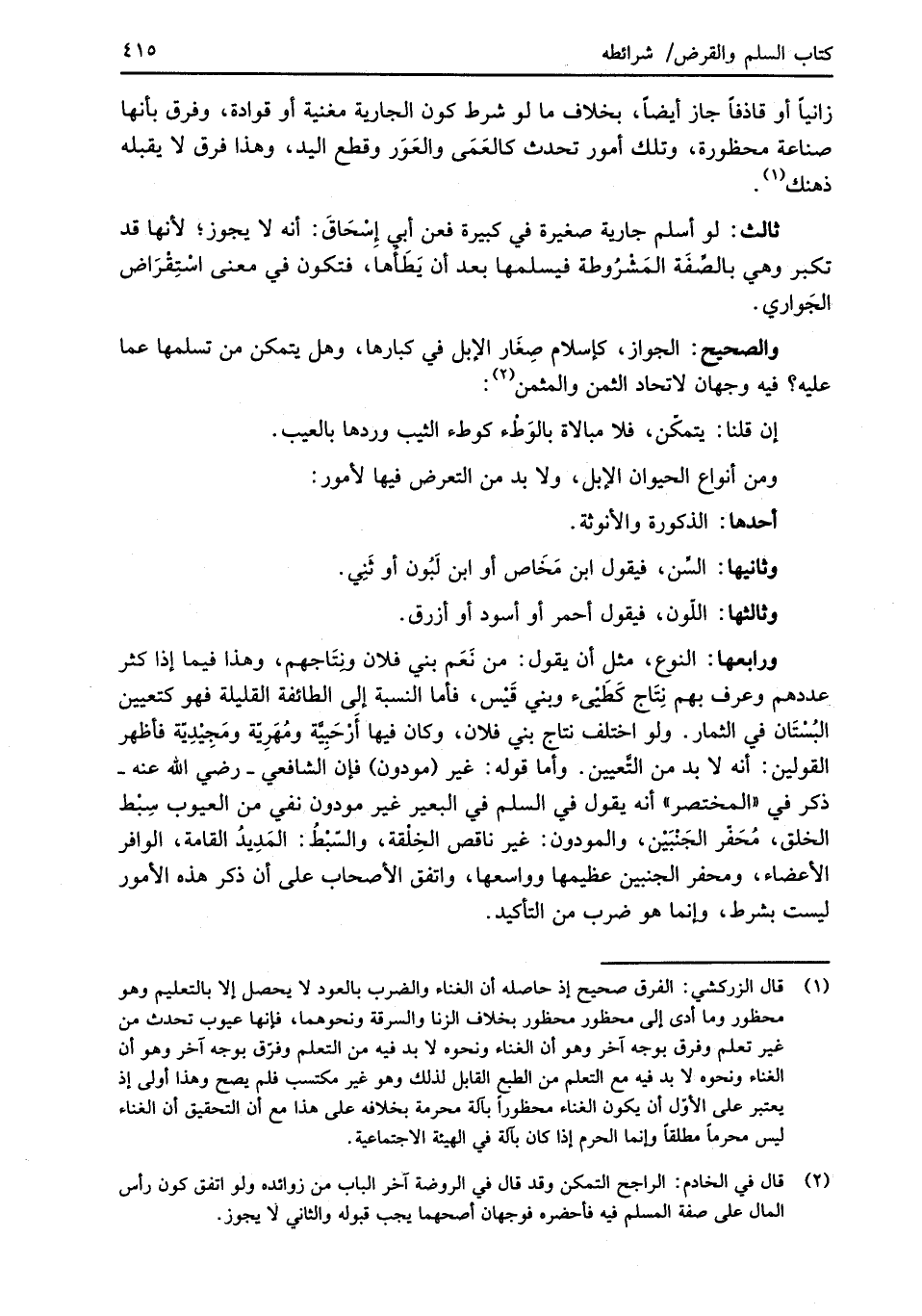 ورابعها: النوع، مثل أن يقول: من نَعَم بني فلان ونتَاجهم، وهذا فيما إذا كثر عددهم وعرف بهم نِتَاج كَطَيْئ وبني قَيْس، فأما النسبة إلى الطائفة القليلة فهو كتعيين البُسْتَان في الثمار. ولو اختلف نتاج بني فلان، وكان فيها أَرْحَبِيَّة ومُهَرِيّة ومَجِيْدِيّة فأظهر القولين: أنه لا بد من التَّعيين. وأما قوله: غير (مودون) فإن الشافعي -رضي الله عنه- ذكر في "المختصر" أنه يقول في السلم في البعير غير مودون نفي من العيوب سِبْط الخلق، مُحَفّر الجَنْبَيْن، والمودون: غير ناقص الخِلقة، والسّبْطُ: المَدِيدُ القامة، الوافر الأعضاء، ومحفر الجنبين عظيمها وواسعها، واتفق الأصحاب على أن ذكر هذه الأمور ليست بشرط، وإنما هو ضرب من التأكيد.
