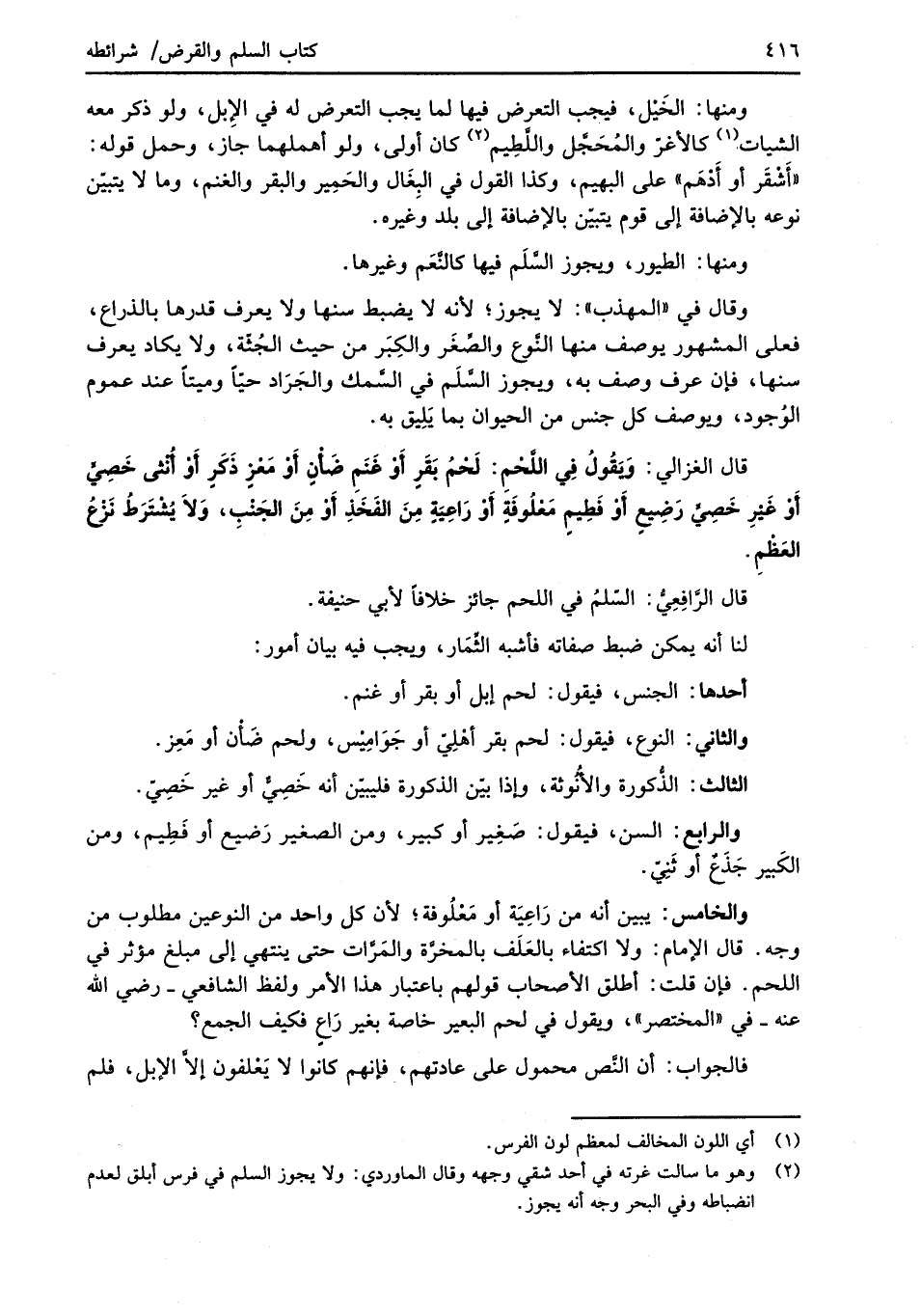 وقال في "المهذب": لا يجوز؛ لأنه لا يضبط سنها ولا يعرف قدرها بالذراع، فعلى المشهور يوصف منها النَّوع والصِّغَر والكِبَر من حيث الجُثّة، ولا يكاد يعرف سنها، فإن عرف وصف به، ويجوز السَّلَم في السَّمك والجَرَاد حيّاً وميتاً عند عموم الوُجود، ويوصف كل جنس من الحيوان بما يَلِيق به.