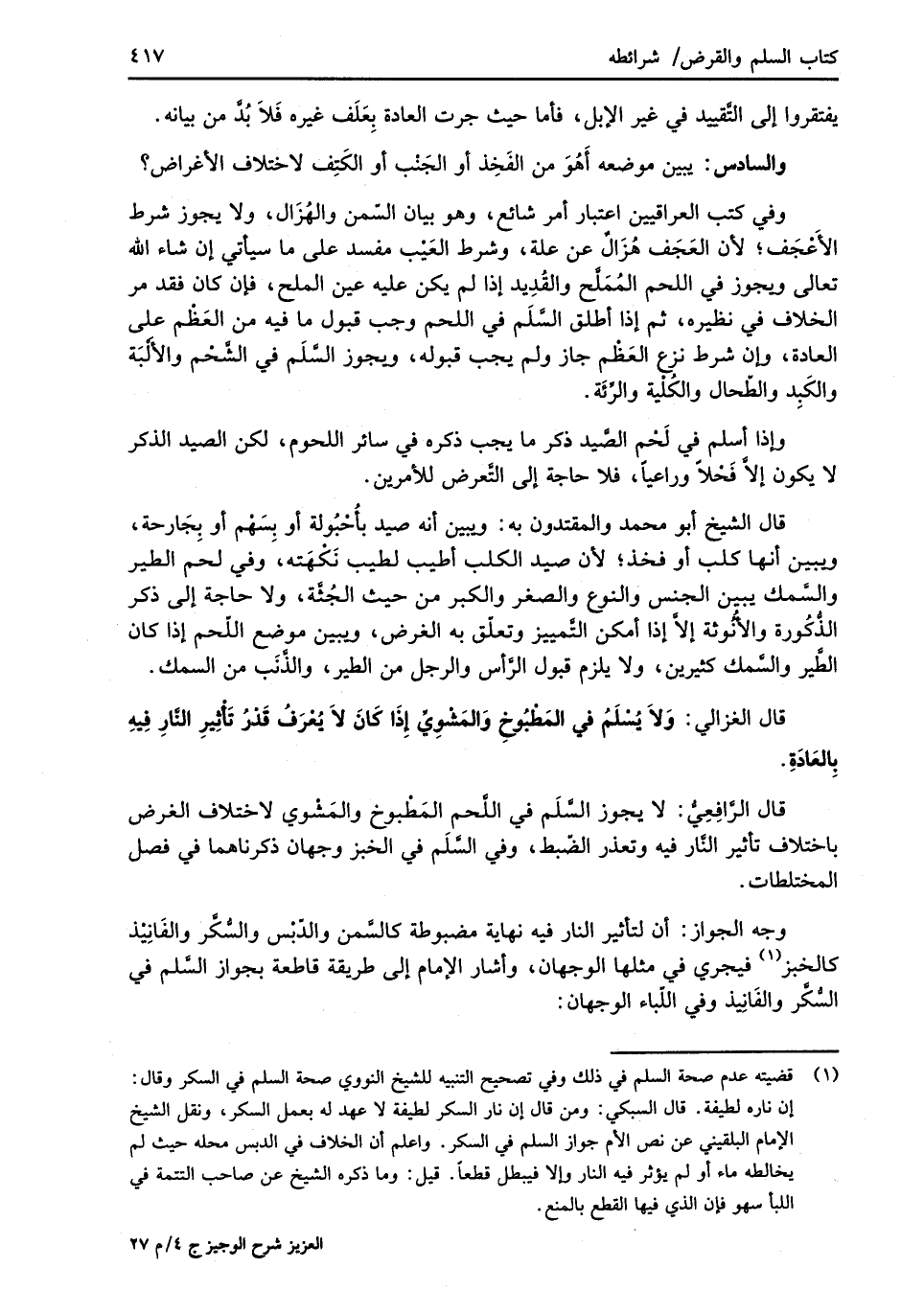 وفي كتب العراقيين اعتبار أمر شائع، وهو بيان السّمن والهُزَال، ولا يجوز شرط الأَعْجَف؛ لأن العَجَف هُزَالٌ عن علة، وشرط العَيْب مفسد على ما سيأتي إن شاء الله تعالى ويجوز في اللحم المُمَلَّح والقُدِيد إذا لم يكن عليه عين الملح، فإن كان فقد مر الخلاف في نظيره، ثم إذا أطلق السَّلَم في اللحم وجب قبول ما فيه من العَظْم على العادة، وإن شرط نزع العَظْم جاز ولم يجب قبوله، ويجوز السَّلَم في الشَّحْم والأَلْبَة والكَبِد والطّحال والكُلْية والرِّئَة.