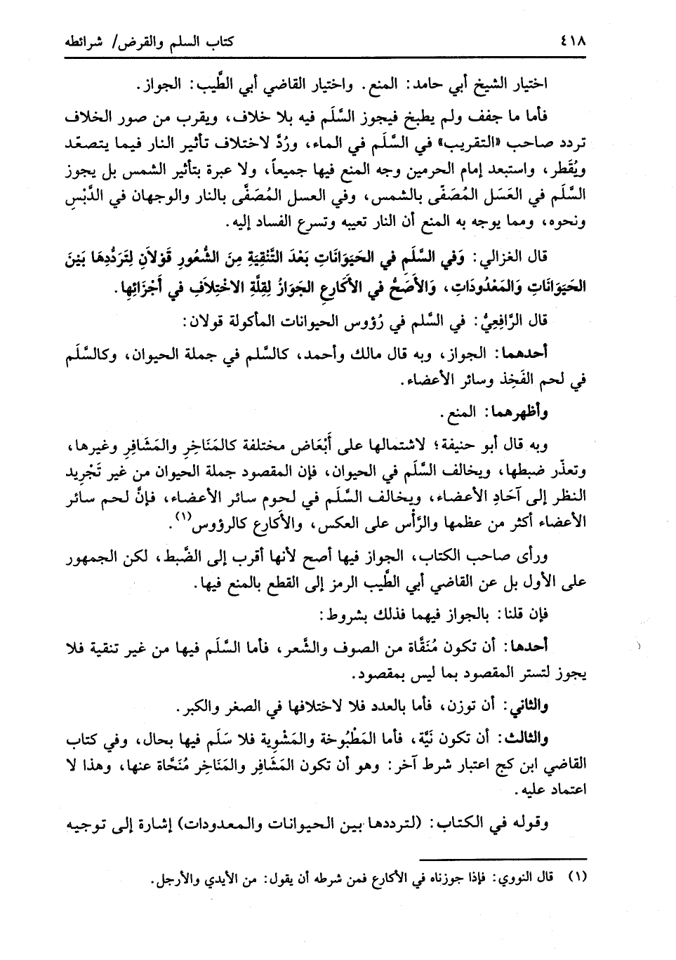 قال الغزالي: وَفي السَّلَمِ في الحَيَوَانَاتِ بَعْدَ التَّنْقِيَةِ مِنَ الشُّعُورِ قَوْلاَنِ لِتَرَدُّدِهَا بَيْنَ الحَيَوَانَاتِ وَالمَعْدُودَاتِ، وَالأَصَحُّ في الأَكَارعِ الجَوَازُ لِقِلَّةِ الاخْتِلاَفِ في أَجْزَائِهِا.