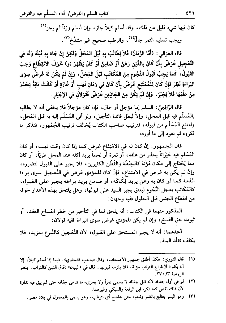 قال الغزالي: (أَمَّا الزَّمَانُ) فَلاَ يُطَالَبُ بِهِ قَبلَ المَحَلِّ وَلَكِنْ إِنْ جَاءَ بِهِ قَبْلَهُ وَلَه فِي التَّعْجِيلِ غَرَضٌ بِأَنْ كَانَ بِالدَّيْنِ رَهْنٌ أَوْ ضَامِنٌ أَوْ كَانَ يَظْهَرُ (و) خَوْفُ الانْقِطَاع وَجَبَ القَبُولُ، كَمَا يَجِب قَبُولُ النُّجُومِ مِنَ المُكَاتَبِ قَبْلَ المَحَلِّ، وَإِنْ لَمْ يَكُنْ لَهُ غَرَضٌ سِوَى البَرَاءَةِ نُظِرَ فَإنْ كَانَ لِلْمُمْتَنِعِ غرَضٌ بِأَنْ كَانَ فِي زَمَانِ نَهْبٍ أَوْ غَارَةٍ أَوْ كَانَتْ دَابَّةٌ يَحْذَرُ مِنْ عَلْفِهَا فلاَ يُجْبَرُ، وَإِنْ لَمْ يَكُنْ مِنَ الجَانبيْنِ غرَضٌ فَقَوْلاَنِ في الإِجْبَارِ.