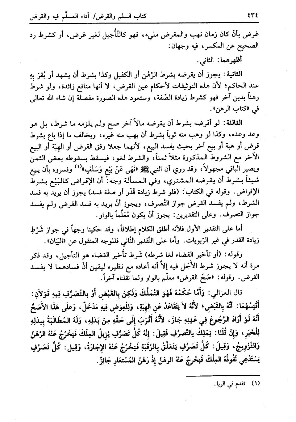 الثالثة: لو أقرضه بشرط أن يقرضه مالاً آخر صح ولم يلزمه ما شرط، بل هو وعد وعده، وكذا لو وهب منه ثوباً بشرط أن يهب منه غيره، ويخالف ما إذا باع بشرط قرض أو هبة أو بيع آخر بحيث يفسد البيع، لأنهما جعلا رفق القرض أو الهِبَة أو البيع الآخر مع الشروط المذكورة مثلاً ثمناً، والشرط لغو، فيسقط بسقوطه بعض الثمن ويصير الباقي مجهولاً، وقد روي أن النبي -صلى الله عليه وسلم- "نَهَى عَنْ بَيْعٍ وَسَلَفٍ" (¬1) وفسروه بأن يبيع شيئاً بشرط أن يقرضه المشتري، وفي المسألة وجه: أن الإقراض كالبَيْع بشرط الإقراض. وقوله في الكتاب: (فلو شرط زيادة قَدْر أو صفة فسد) يجوز أن يريد به فسد الشرط، ولم يفسد القرض جواز التَّصرف، ويجوز أنْ يريد به فسد القرض ولم يفسد جواز التصرف. وعلى التقديرين: يجوز أنْ يكون مُعَلَّماً بالواو.