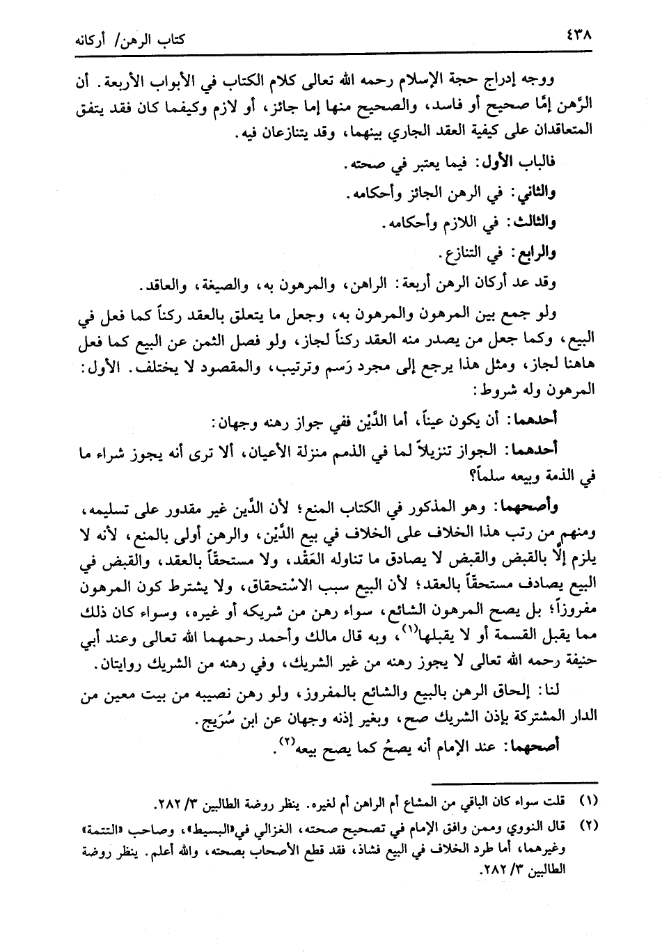 ووجه إدراج حجة الإسلام رحمه الله تعالى كلام الكتاب في الأبواب الأربعة. أن الرَّهن إمَّا صحيح أو فاسد، والصحيح منها إما جائز، أو لازم وكيفما كان فقد يتفق المتعاقدان على كيفية العقد البخاري بينهما، وقد يتنازعان فيه.