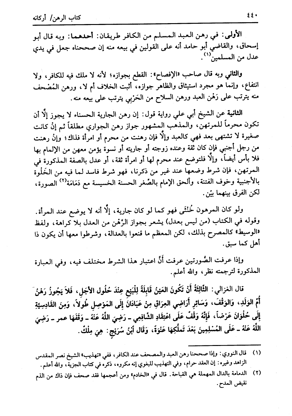 (¬1) قال النووي: وإذا صححنا رهن العبد والمصحف عند الكافر، ففي "تهذيب" الشيخ نصر المقدس الزاهد وغيره: إن العقد حرام، وفي التهذيب للبغوي إنه مكروه، ذكره في كتاب الجزية، والله أعلم.