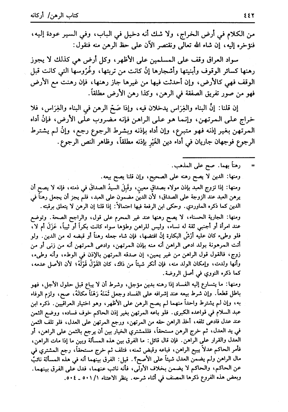 سواد العراق وقف على المسلمين على الأظهر، وكل أرض هي كذلك لا يجوز رهنها كسائر الوقوف وأبنيتها وأشجارها إنْ كانت من تربتها، وغُرُوسها التي كانت قبل الوقف فهي كالأرض، وإن أحدثت فيها من غيرها جاز رهنها، فإن رهنت مع الأرض فهو من صور تفريق الصفقة في الرهن، وكذا رهن الأرض مطلقاً.