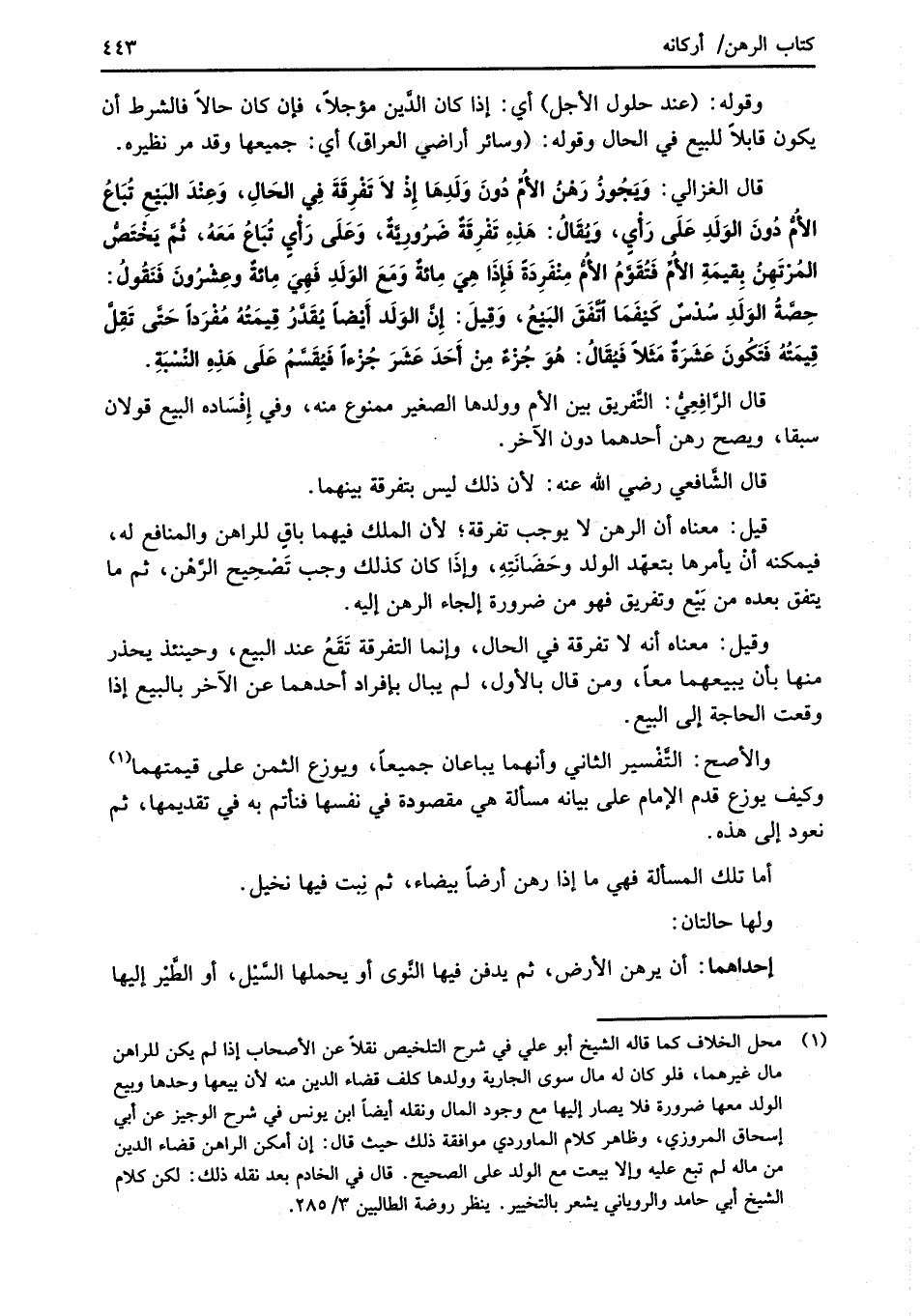 قال الغزالي: وَيَجُوزُ رَهْنُ الأُمِّ دُونَ وَلَدِهَا إِذْ لاَ تَفْرِقَةَ فِي الحَالِ، وَعِنْدَ البَيْعِ تُبَاعُ الأُمُّ دُونَ الوَلَدِ عَلَى رَأْيِ، وَيُقَالُ: هَذِهِ تَفْرِقَةٌ ضَرُورِيَّةٌ، وَعَلَى رَأْيِ تُبَاعُ مَعَهُ، ثُمَّ يَخْتَصُّ المُرْتَهِنُ بِقيمَةِ الأُمِّ فَتُقَوَّمُ الأُمُّ مِنْفَرِدَةً فَإذَا هِيَ مِائةٌ وَمَعَ الوَلَدِ فَهِيَ مِائةٌ وعِشْرُونَ فَنَقُولُ: حِصَّةُ الوَلَدِ سُدْسٌ كَيْفَمَا اتَّفَقَ البَيْعُ، وَقِيلَ: إِنَّ الوَلَد أَيْضاً يُقَدَّرُ قِيمَتُهُ مُفْرَداً حَتَّى تَقِلَّ قِيمَتُهُ فَتَكُونَ عَشَرَةٌ مَثَلاً فَيُقَالُ: هُوَ جُزْءٌ مِنْ أَحَدَ عَشَرَ جُزْءاً فَيُقَسَّمُ عَلَى هَذِهِ النِّسْبَةِ.