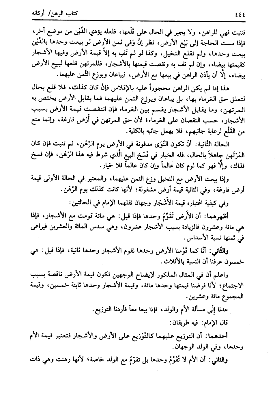 واعلم أن في المثال المذكور لإيضاح الوجهين تكون قيمة الأرض ناقصة بسبب الاجتماع؛ لأنا فرضنا قيمتها وحدها مائة، وقيمة الأشجار وحدها ثابتة خمسين، وقيمة المجموع مائة وعشرين.