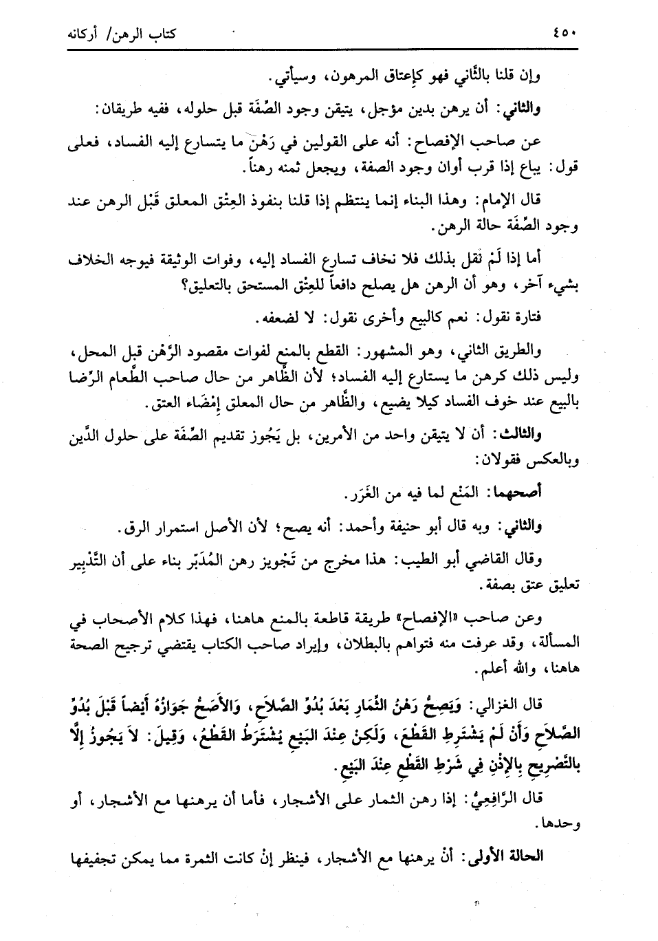 قال الغزالي: وَيَصِحُّ رَهْنُ الثِّمَارِ بَعْدَ بُدُوِّ الصَّلاَحِ، وَالأَصَحُّ جَوَازُهُ أَيْضاً قَبْلَ بُدُوِّ الصَّلاَحِ وإنْ لَمْ يَشْتَرِطِ القَطْعَ، وَلَكِنْ عِنْدَ البَيْعِ يُشْتَرَطُ القَطْعُ، وَقِيلَ: لاَ يَجْوزُ إِلاَّ بالتَّصْرِيحِ بِالإِذْنِ فِي شَرْطِ القَطْعِ عِنْدَ البَيْعِ.