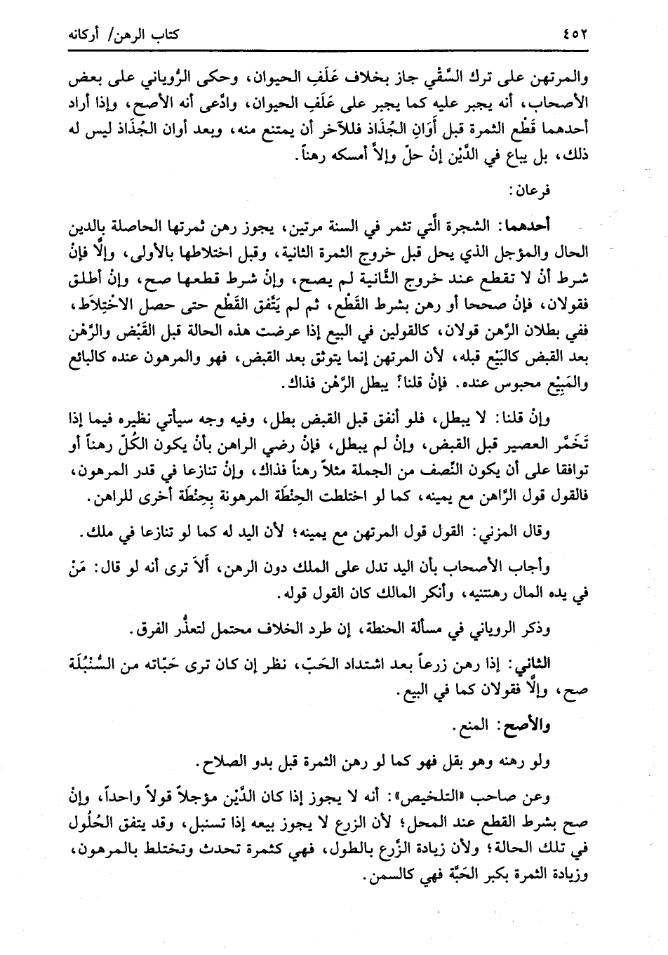 أحدهما: الشجرة الَّتي تثمر في السنة مرتين، يجوز رهن ثمرتها الحاصلة بالدين الحال والمؤجل الذي يحل قبل خروج الثمرة الثانية، وقبل اختلاطها بالأولى، وإلاَّ فإنْ شرط أنْ لا تقطع عند خروج الثَّانية لم يصح، وإنْ شرط قطعها صح، وإنْ أطلق فقولان، فإنْ صححا أو رهن بشرط القَطْع، ثم لم يَتَّفق القَطْع حتى حصل الاخْتِلاَط، ففي بطلان الرَّهن قولان، كالقولين في البيع إذا عرضت هذه الحالة قبل القَبْض والرَّهْن بعد القبض كالبَيْع قبله، لأن المرتهن إنما يتوثق بعد القبض، فهو والمرهون عنده كالبائع والمَبِيْع محبوس عنده. فإنْ قلنا: يبطل الرَّهْن فذاك.