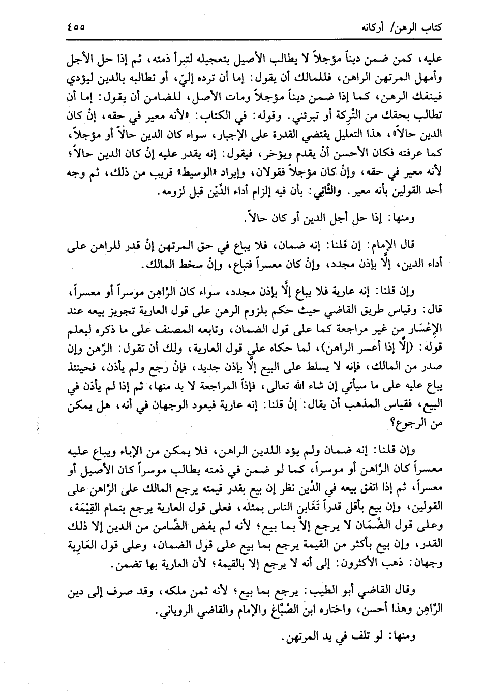 عليه، كمن ضمن ديناً مؤجلاً لا يطالب الأصيل بتعجيله لتبرأ ذمته، ثم إذا حل الأجل وأمهل المرتهن الراهن، فللمالك أن يقول: إما أن ترده إليّ، أو تطالبه بالدين ليؤدي فينفك الرهن، كما إذا ضمن ديناً مؤجلاً ومات الأصل، للضامن أن يقول: إما أن تطالب بحقك من التَّرِكة أو تبرئني. وقوله: في الكتاب: "لأنه معير في حقه، إنْ كان الدين حالاً"، هذا التعليل يقتضي القدرة على الإجبار، سواء كان الدين حالاً أو مؤجلاً، كما عرفته فكان الأحسن أنْ يقدم ويؤخر، فيقول: إنه يقدر عليه إنْ كان الدين حالاً؛ لأنه معير في حقه، وإن كان مؤجلاً فقولان، وإيراد "الوسيط" قريب من ذلك، ثم وجه أحد القولين بأنه معير. والثَّاني: بأن فيه إلزام أداء الدَّيْن قبل لزومه.