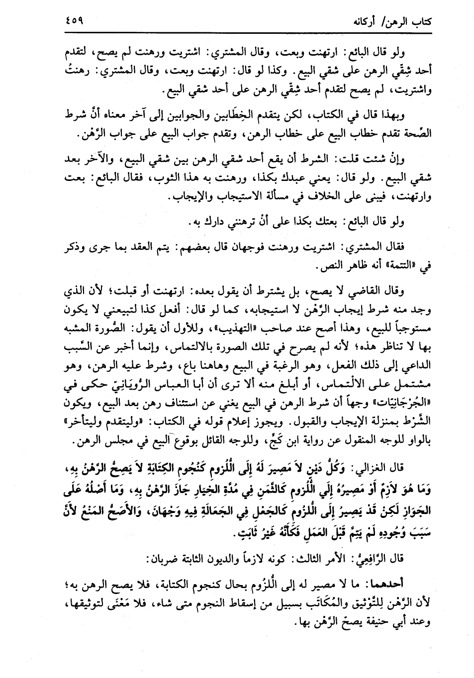 قال الغزالي: وَكُلُّ دَيْنٍ لاَ مَصِيرَ لَهُ إِلَى الُّلُزومِ كَنُجُومِ الكِتَابَةِ لاَ يَصِحُّ الرَّهْنُ بِهِ، وَمَا هُوَ لاَزِمٌ أَوْ مَصِيرُهُ إِلَي الّلُزومِ كَالثَّمَنِ فِي مُدَّةِ الخِيَارِ جَازَ الرَّهْنُ بِهِ، وَمَا أَصْلُهُ عَلَى الجَوَازِ لَكِن قَدْ يَصِيرُ إِلَى الُّلزُوم كَالجَعْلِ فِي الجَعَالَةِ فِيهِ وَجْهَانَ، وَالأَصَحُّ المَنْعُ لأَنَّ سَبَبَ وُجُودِهِ لَمْ يَتِمَّ قَبلَ العَمَلِ فَكَأنَّهُ غَيْرُ ثَابَتٍ.