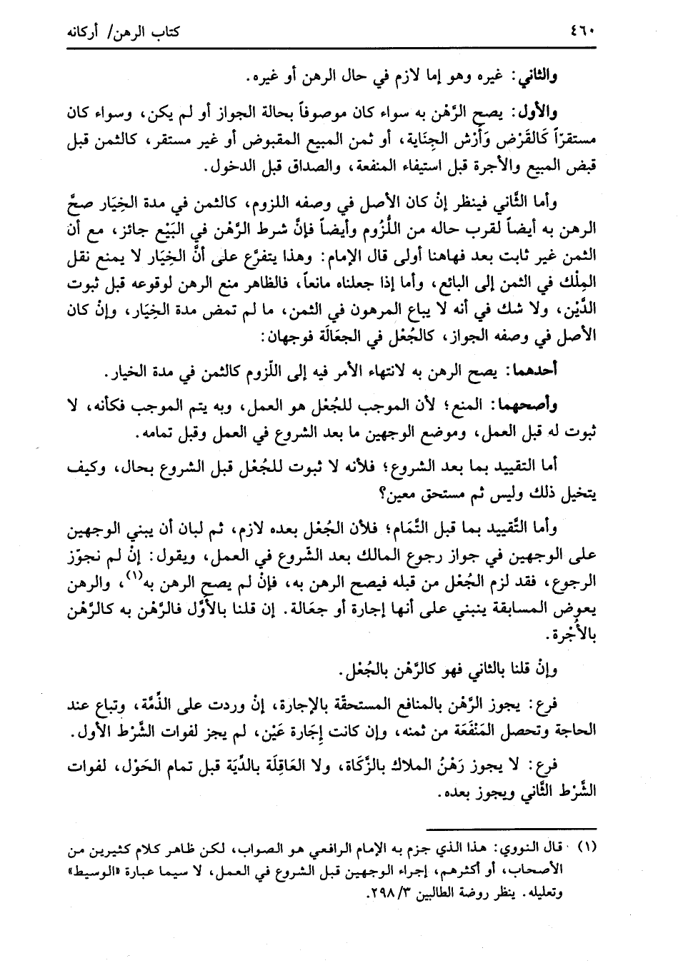 وأما الثَّاني فينظر إنْ كان الأصل في وصفه اللزوم، كالثمن في مدة الخِيَار صحَّ الرَّهْن به أيضاً لقرب حاله من اللُّزُوم وأيضاً فإنَّ شرط الرَّهْن في البَيْع جائز، مع أن الثمن غير ثابت بعد فهاهنا أولى قال الإمام: وهذا يتفرَّع على أنَّ الخِيَار لا يمنع نقل المِلْك في الثمن إلى البائع، وأما إذا جعلناه مانعاً، فالظاهر منع الرَّهْن لوقوعه قبل ثبوت الدَّيْن، ولا شك في أنه لا يباع المرهون في الثمن، ما لم تمض مدة الخِيَار، وإنْ كان الأصل في وصفه الجواز، كالجُعْل في الجعَالَة فوجهان: