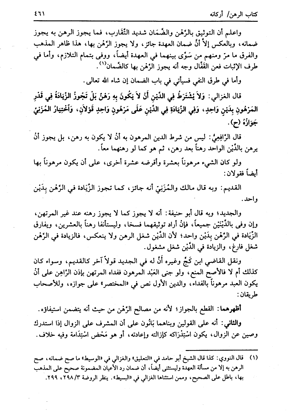 قال الغزالي: وَلاَ يُشْتَرَطُ فِي الدَّيْنِ أَنْ لاَ يَكُونَ بِهِ رَهْنٌ بَلْ تَجُوزُ الزِّيَادَةُ فِي قَدْرِ المَرْهُونِ بِدَيْنٍ وَاحِدٍ، وَفِي الزِّيَادَةِ فِي الدَّيْنِ عَلَى مَرْهُونٍ وَاحِدٍ قَوْلاَنِ، وَاخْتِيَارُ المُزَنِيِّ جَوَازُهُ (ح).