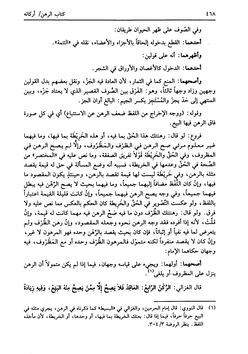 (¬1) قال النووي: قال إمام الحرمين، والغزالي في "البسيط" كما ذكرناه في الرَّهْن، يجري مثله في البيع حرفاً حرفاً، فيما إذا قال: بعتك الخريطة بما فيها، أو وحدها، أو الخريطة، لأن مأخذه اللفظ. ينظر الروضة 3/ 304.