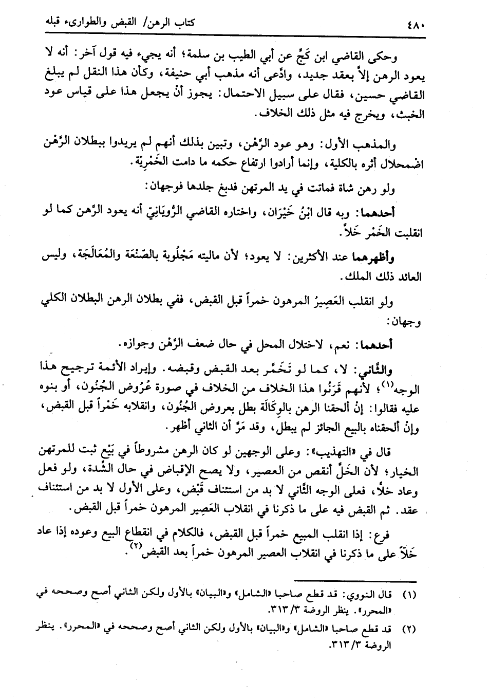 والمذهب الأول: وهو عود الرَّهْن، وتبين بذلك أنهم لم يريدوا ببطلان الرَّهْن اضْمحلال أثره بالكلية، وإنما أرادوا ارتفاع حكمه ما دامت الخَمْرِيّة.