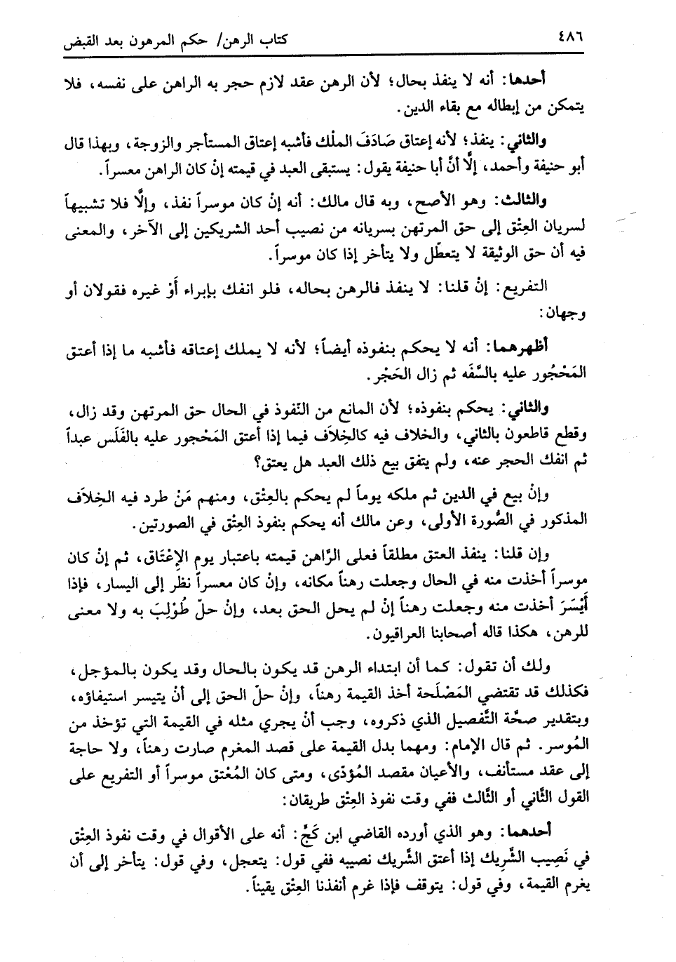 والثالث: وهو الأصح، وبه قال مالك: أنه إنْ كان موسراً نفذ، وإلاَّ فلا تشبيهاً لسريان العِتْق إلى حق المرتهن بسريانه من نصيب أحد الشريكين إلى الآخر، والمعنى فيه أن حق الوثيقة لا يتعطّل ولا يتأخر إذا كان موسراً.