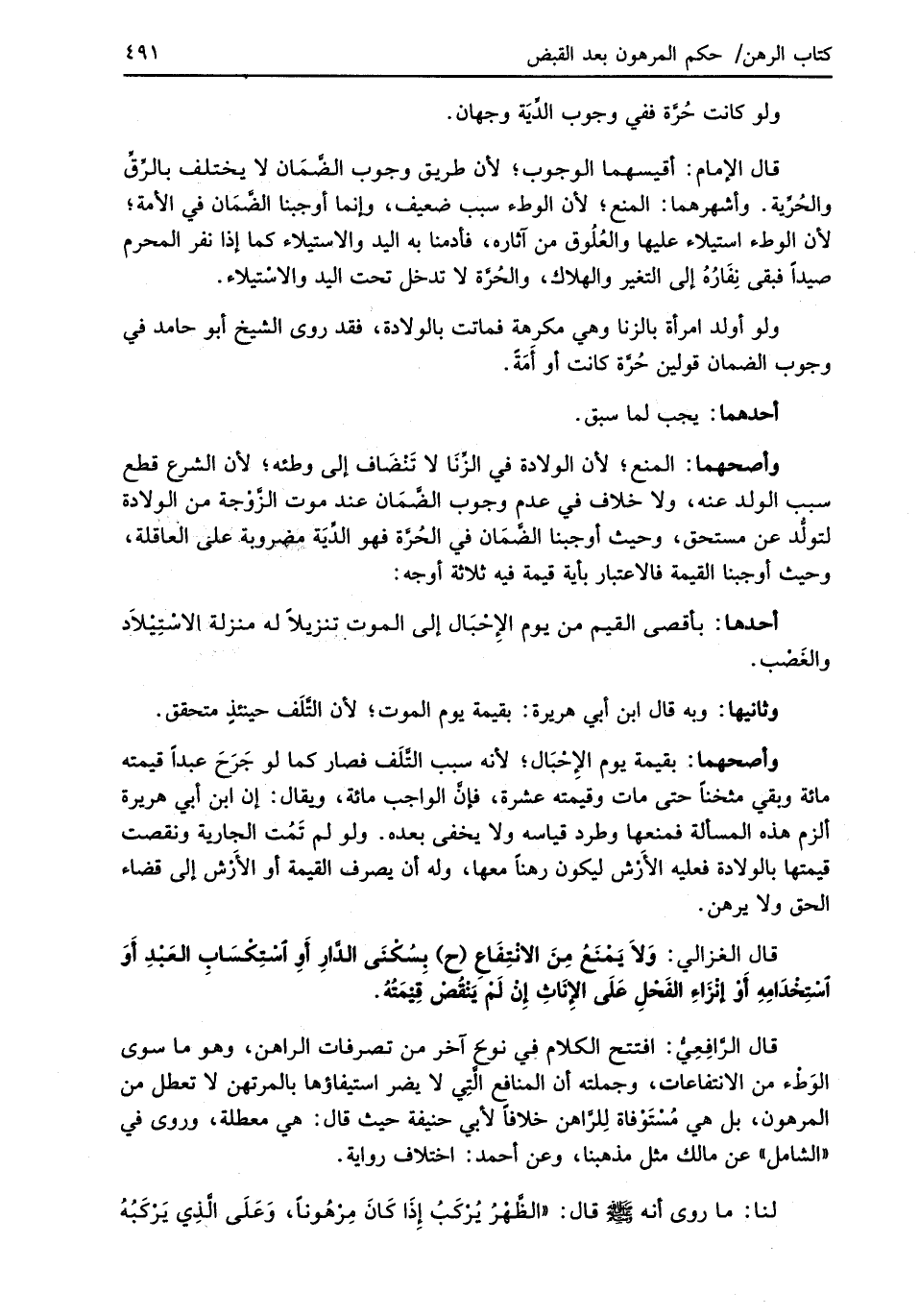 قال الرَّافِعِيُّ: افتتح الكلام في نوع آخر من تصرفات الراهن، وهو ما سوى الوَطْء من الانتفاعات، وجملته أن المنافع الَّتِي لا يضر استيفاؤها بالمرتهن لا تعطل من المرهون، بل هي مُسْتَوْفاة لِلرَّاهن خلافاً لأبي حنيفة حيث قال: هي معطلة، وروى في "الشامل" عن مالك مثل مذهبنا، وعن أحمد: اختلاف رواية.