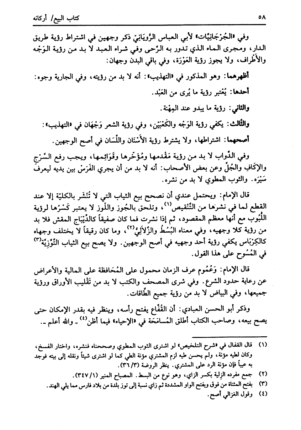 قال الإمام: وَعُمُوم عرف الزمان محمول على المُحَافظة على المالية والأعراض عن رعاية حدود الشرع. وفي شرى المصحف والكتب لا بد من تَقْليب الأوراق ورؤية جميعها، وفي البياض لا بد من رؤية جميع الطَّاقات.