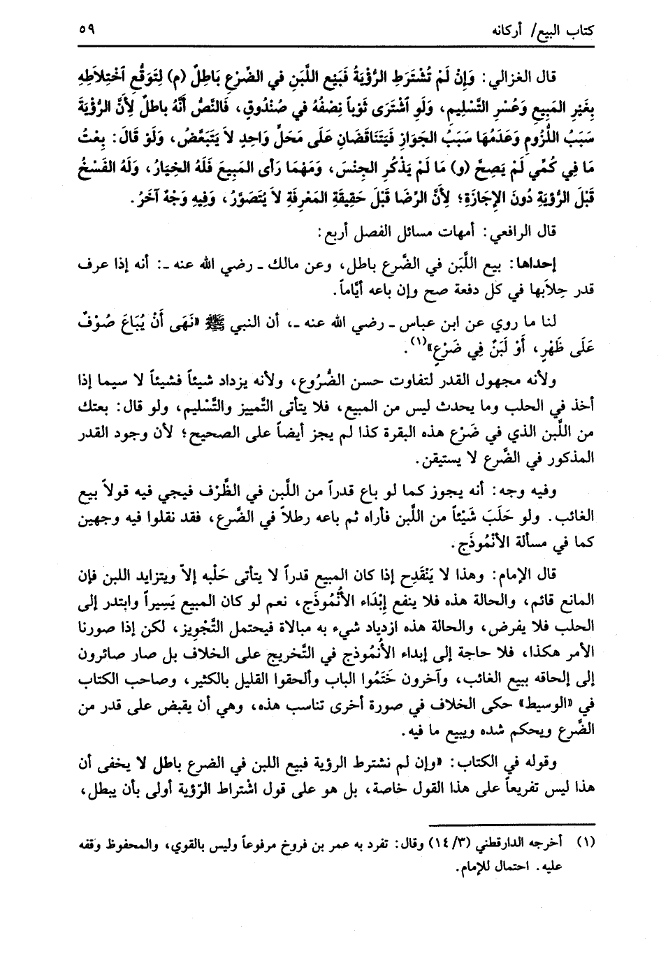 قال الغزالي: وَإِنْ لَمْ تُشْتَرَطِ الرُّؤْيَةُ فَبَيْع اللَّبَنِ في الضِّرْعِ بَاطِلٌ (م) لِتَوَقُّعِ اخْتِلاَطِهِ بِغَيْرِ المَبِيعِ وَعُسْرِ التَّسْلِيمِ، وَلَوِ اشْتَرَى ثَوْباً نِصْفُهُ في صُنْدُوقِ، فَالنَّصُّ أَنَّهُ باطلٌ لِأَنَّ الرُّؤْيَةَ سَبَبُ اللُّزُومِ وَعَدَمُهَا سَبَبُ الجَوَازِ فَيَتَنَاقَضَانِ عَلَى مَحَلٍّ وَاحِدٍ لاَ يَتَبَعَّضُ، وَلَوْ قالَ: بِعْتُ مَا فِي كُمِّي لَمْ يَصِحَّ (و) مَا لَمْ يَذْكُرِ الجِنْسَ، وَمَهْمَا رَأى المَبِيعَ فَلَهُ الخِيَارُ، وَلَهُ الفَسْخُ قَبْلَ الرُّؤيَةِ دُونَ الإِجَازَةِ؛ لِأَنَّ الرِّضَا قَبْلَ حَقِيقَةِ المَعْرِفَةِ لاَ يُتَصَوَّرُ، وَفِيهِ وَجْهٌ آخَرُ.