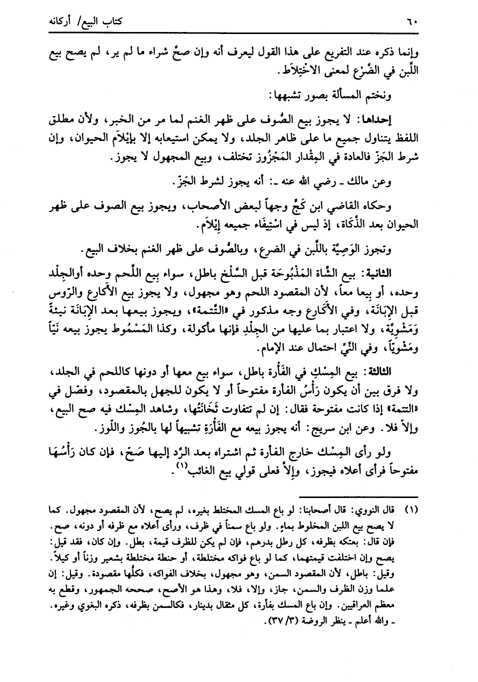 (¬1) قال النووي: قال أصحابنا: لو باع المسك المختلط بغيره، لم يصح، لأن المقصود مجهول. كما لا يصح بيع اللبن المخلوط بماءٍ. ولو باع سمناً في ظرف، ورأى أعلاه مع ظرفه أو دونه، صح. فإن قال: بعتكه بظرفه، كل رطل بدرهم، فإن لم يكن للظرف قيمة، بطل. وإن كان، فقد قيل: يصح وإن اختلفت قيمتهما، كما لو باع فواكه مختلطة، أو حنطة مختلطة بشعير وزناً أو كيلاً. وقيل: باطل، لأن المقصود السمن، وهو مجهول، بخلاف الفواكه، فكلُّها مقصودة. وقيل: إن علماً وزن الظرف والسمن، جاز، وإلا، فلا، وهذا هو الأصح، صححه الجمهور، وقطع به معظم العراقيين. وإن باع المسك بفأرة، كل مثقال بدينار، فكالسمن بظرفه، ذكره البغوي وغيره. -والله أعلم- ينظر الروضة (3/ 37).