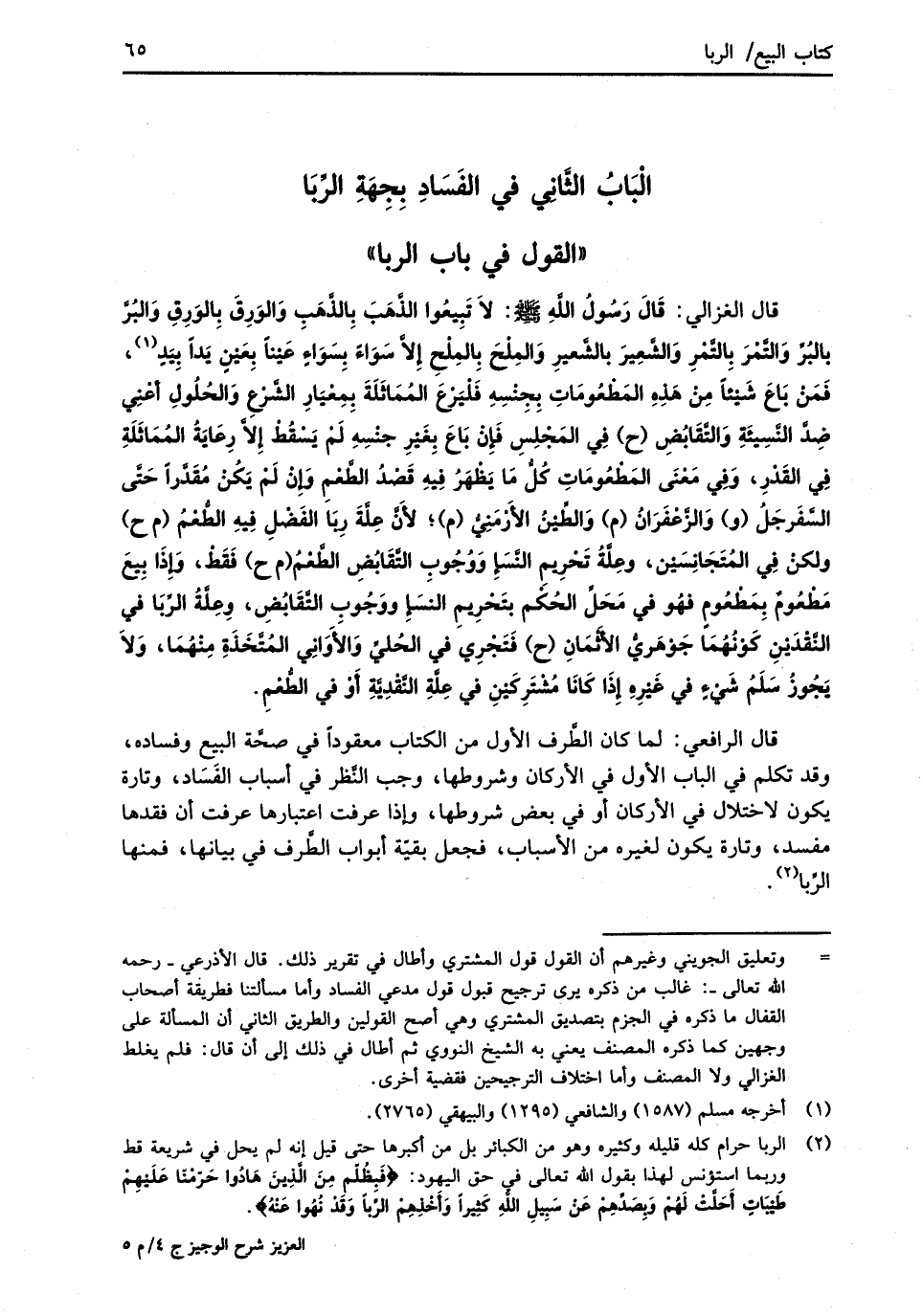 " القول في باب الربا" قال الغزالي: قالَ رَسُولُ اللهِ -صلى الله عليه وسلم-: لاَ تَبِيعُوا الذَّهَبَ بِالذَّهَبِ وَالوَرِقَ بِالوَرِقِ وَالبُرَّ بالبُرِّ وَالتَّمْرَ بِالتَّمْرِ وَالشَّعِيرَ بالشَّعيرِ وَالمِلْحَ بِالمِلْحِ إِلاَّ سَوَاءً بِسَوَاءٍ عَيْنًا بِعَيْنٍ يَداً بِيَدٍ (¬1)، فَمَنْ بَاعَ شَيْئاً مِنْ هَذِهِ المَطْعُومَاتِ بِجِنْسِهِ فَلْيَرْعَ المُمَاثَلَةَ بِمِعْيَارِ الشَّرْعِ وَالحُلُولِ أعْنِي ضِدَّ النَّسِيئَةِ وَالتَّقَابُضِ (ح) فِي المَجْلِسِ فَإنْ بَاعَ بِغَيْرِ جنْسِهِ لَمْ يَسْقُطْ إِلاَّ رِعَايَةُ المُمَاثَلَةِ فِي القَدْرِ، وَفِي مَعْنَى المَطْعُومَاتِ كُلُّ مَا يَظْهَرُ فِيهِ قَصْدُ الطَّعْمِ وَإِنْ لَمْ يَكُنْ مُقَدَّراً حَتَّى السَّفَرجَلُ (و) وَالزَّعْفَرَانُ (م) وَالطِّيْنُ الأَزمَنِيٌّ (م)؛ لأَنَّ عِلَّةَ رِبَا الفَضْلِ فِيهِ الطُّعْمُ (م ح) ولكنْ فِي المُتَجَانِسَيْن، وعِلَّةُ تَحْرِيمِ النَّسَإ وَوُجُوبِ التَّقَابُضِ الطَّعْمُ (م ح) فَقَطْ، وَإذَا بِيعَ مَطْعُومٌ بِمَطْعُومِ فهُو في مَحَلِّ الحُكْم بتَحْرِيمِ النسَإِ ووَجُوبِ التَّقَابُضِ، وِعِلَّةُ الرِّبَا في النَّقْدَينِ كَوْنُهُمَا جَوْهَريُّ الأَثْمَانِ (ح) فَتَجْرِي في الحُليِّ وَالَأوَانِي المُتَّخَذَةِ مِنْهُمَا، وَلاَ يَجُوزُ سَلَمُ شَيْءٍ في غَيْرِهِ إِذَا كَانَا مُشْتَرِكَيْنِ في عِلَّةِ النَّقْدِيَّةِ أَوْ في الطُّعْمِ.