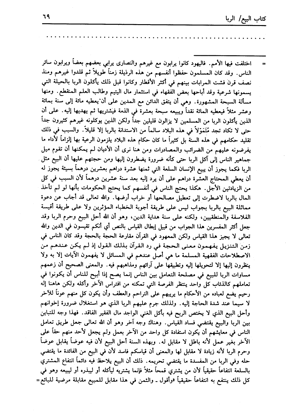 = اختلفت فيها الأمم. فاليهود كانوا يرابون مع غيرهم والنصارى يرابي بعضهم بعضاً ويرابون سائر الناس. وقد كان المسلمون حفظوا أنفسهم من هذه الرذيلة زمناً طويلاً ثم قلدوا غيرهم ومنذ نصف قرن فشت المرابات بينهم في أكثر الأقطار وكانوا قبل ذلك يأكلون الربا بالحيلة التي يسمونها شرعية وقد أباحها بعض الفقهاء في استثمار مال اليتيم وطالب العلم المنقطع. ومنها مسألة السبحة المشهورة. وهي أن يتفق الدائن مع المدين على أن يعطيه مائة إلى سنة بمائة وعشر مثلاً فيعطيه المائة نقداً ويبيعه سبحة بعشرة في الذمة فيشتريها ثم يهديها إليه. على أن الذين يأكون الربا من المسلمين لا يزالون قليلين جداً ولكن الذين يوكلونه غيرهم كثيرون جداً حتى لا تكاد تجد متَمَوّلاً في هذه البلاد سالماً من الاستدانة بالربا إلا قليلاً. والسبب في ذلك تقليد حكامهم في هذه السنة بل كثيراً ما كان حكام هذه البلاد يلزمون الرعية بها إلزاماً لأداء ما يفرضونه عليهم من الضرائب والمصادرات ومن هنا نرى أن الأديان لم يمكنها أن تقوم ميل جماهير الناس إلى آكل الربا حتى كأنه ضرورة يضطرون إليها ومن حجتهم عليها أن البيع مثل الربا فكما يجوز أن يبيع الإنسان السلعة التي ثمنها عشرة دراهم بعشرين درهماً بسيئة يجوز له أن يعطي المحتاج العشرة دراهم على أن يرد إليه بعد سنة عشرين درهماً لأن السبب في كل من الزيادتين الأجل. هكذا يحتج الناس في أنفسهم كما يحتج الحكومات بأنها لو لم تأخذ المال بالربا لاضطرت إلى تعطيل مصالحها أو خراب أرضها. والله تعالى قد أجاب عن دعوة مماثلة البيع بالربا بجواب ليس على طريقة أجوبة الخطباء المؤثرين ولا على طريقة أقيسة الفلاسفة والمنطقيين، ولكنه على سنة هداية الدين، وهو أن الله أحل البيع وحرم الربا وقد جعل أكثر المفسرين هذا الجواب من قبيل إبطال القياس بالنص أي أنكم تقيسون في الدين والله تعالى لا يجيز هذا القياس ولكن المعهود في القرآن مقارعة الحجة بالحجة وقد كان الناس في زمن التنزيل يفهمون معنى الحجة في رد القرآن بذلك القول إذ لم يكن عندهم من الاصطلاحات الفقهية المسلمة ما هي أصل عندهم في المسائل لا يفهمون الآيات إلا به ولا ينظرون إليها إلا لتحويلها إليه وتطبيقها على آَرائهم ومذاهبهم فيه. والمعنى الصحيح أن زعمهم مساوات الربا للبيع في مصلحة التعامل بين الناس إنما يصح إذا أبيح للناس أن يكونوا في تعاملهم كالذئاب كل واحد ينتظر الفرصة التي تمكنه من افتراس الآخر وأكله ولكن هاهنا إله رحيم يضع لعباده من الأحكام ما يريبهم على التراحم والعطف وأن يكون كل منهم عوناً للآخر لا سيما عند شدة الحاجة إليه. ولذلك جرم عليهم الربا الذي هو استغلال ضرورة إخوانهم وأحل البيع الذي لا يختص الربح فيه بأكل الغني الواجد مال الفقير الفاقد. فهذا وجه للتباين بين الربا والبيع يقتضي فساد القياس. وهناك وجه آخر وهو أن الله تعالى جعل طريق تعامل الناس في معايشهم أن يكون استفادة كل واحد من الآخر بعمل ولم يجعل لأحد منهم حقاً على الآخر بغير عمل لأنه باطل لا مقابل له. وبهذه السنة أحل البيع لأن فيه عوضاً يقابل عوضاً وحرم الربا لأنه زيادة لا مقابل لها والمعنى أن قياسكم فاسد لأن في البيع من الفائدة ما يقتضي حله وفي الربا من المفسدة ما يقتضي تحريمه. ذلك أن البيع يلاحظ فيه دائماً انتفاع المشتري بالسلعة انتفاعاً حقيقياً لأن من يشتري قمحاً مثلاً فإنما يشتريه ليأكله أو ليبذره أو ليبيعه وهو في كل ذلك ينتفع به انتفاعاً حقيقياً "وأقول -والثمن في هذا مقابل للمبيع مقابلة مرضية للبائع =