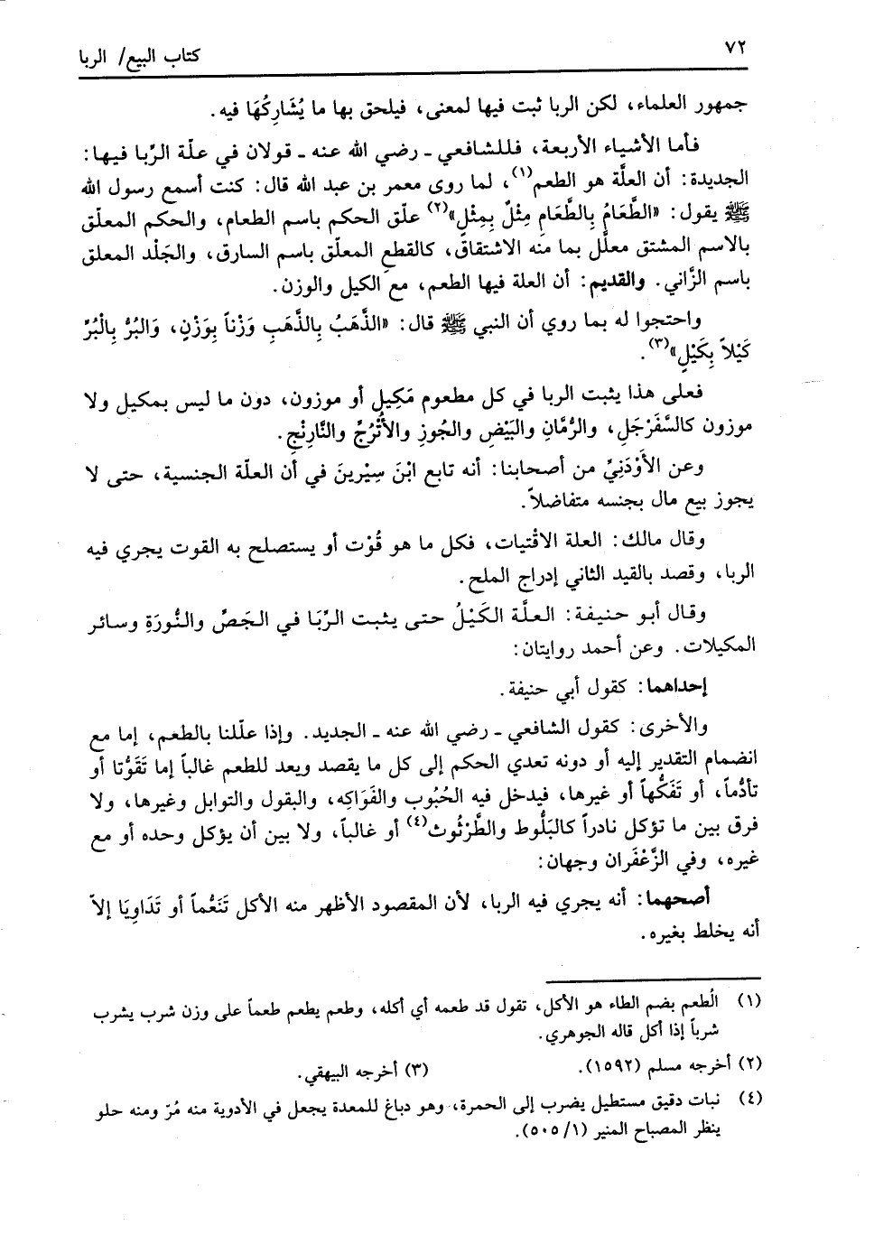 فأما الأشياء الأربعة، فللشافعي -رضي الله عنه- قولان في علْة الرِّبا فيها: الجديدة: أن العلَّة هو الطعم (¬1)، لما روى معمر بن عبد الله قال: كنت أسمع رسول الله -صلى الله عليه وسلم- يقول: "الطَّعَامُ بِالطَّعَامِ مِثْلٌ بِمِثْلِ" (¬2) علّق الحكم باسم الطعام، والحكم المعلّق بالاسم المشتق معلَّل بما منه الاشتقاق، كالقطعِ المعلّق باسم السارق، والجَلْد المعلق باسم الزَّاني. والقديم: أن العلة فيها الطعم، مع الكيل والوزن.