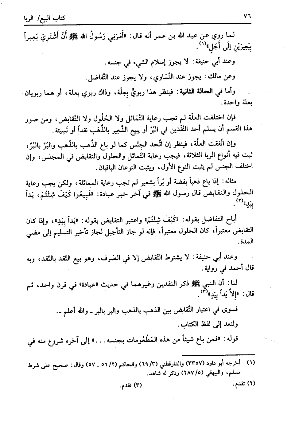 مثاله: إذا باع ذهباً بفضة أو بُراً بشعير لم تجب رعاية المماثلة، ولكن يجب رعاية الحلول والتقابض قال رسول الله -صلى الله عليه وسلم- في آخر خبر عبادة: "فَبيعُوا كَيْفَ شِئْتُمْ، يَداً بِيَدٍ" (¬2).