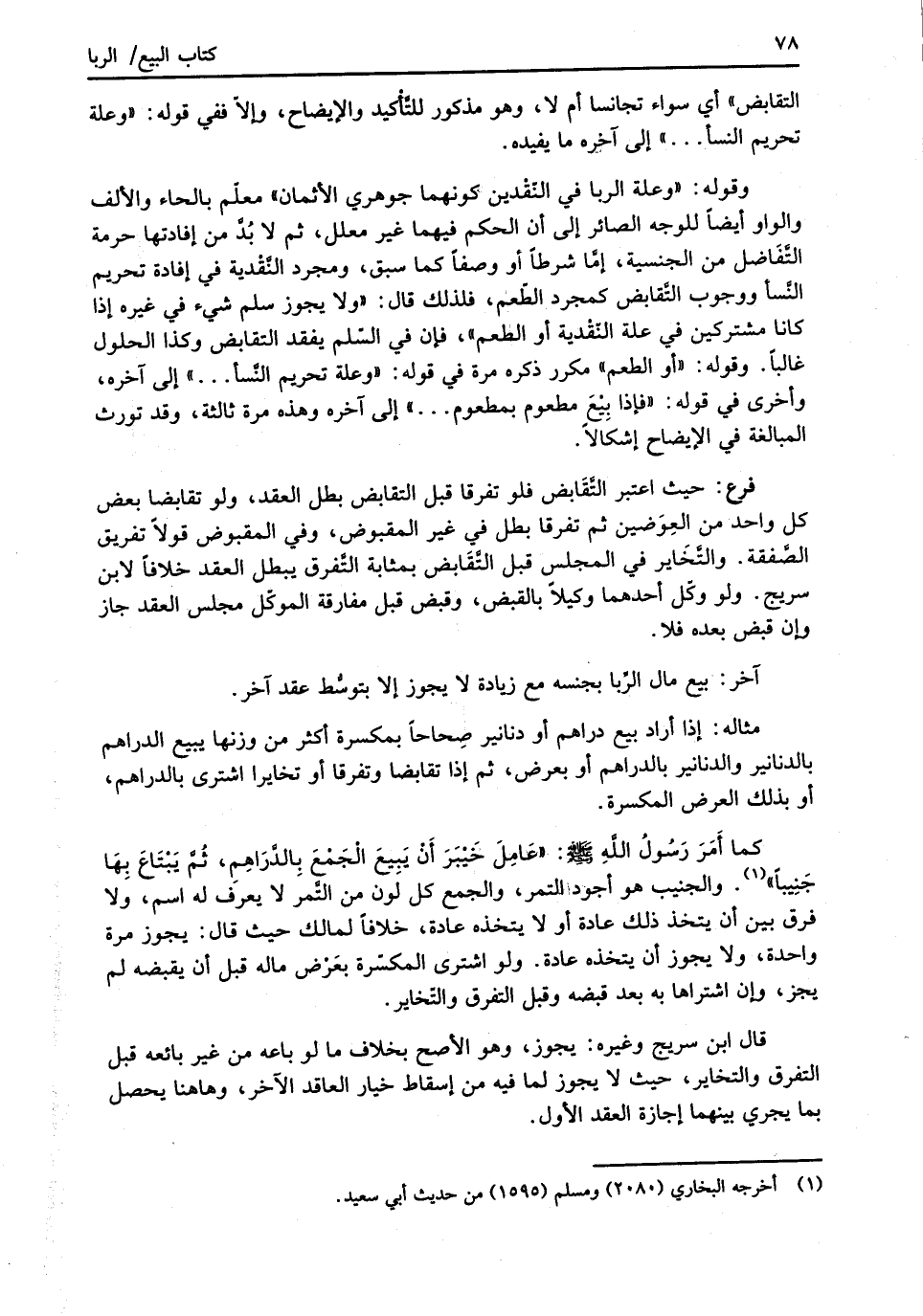 وقوله: "وعلة الربا في النّقْدين كونهما جوهري الأثمان" معلّم بالحاء والألف والواو أيضاً للوجه الصائر إلى أن الحكم فيهما غير معلل، ثم لا بُدَّ من إفادتها حرمة التَّفَاضل من الجنسية، إمَّا شرطاً أو وصفاً كما سبق، ومجرد النَّقْدية في إفادة تحريم النَّسأ ووجوب التَّقابض كمجرد الطّعم، فلذلك قال: "ولا يجوز سلم شيء في غيره إذا كانا مشتركين في علة النّقْدية أو الطعم"، فإن في السّلم يفقد التقابض وكذا الحلول غالباً. وقوله: "أو الطعم" مكرر ذكره مرة في قوله: "وعلة تحريم النَّسأ ... " إلى آخره، وأخرى في قوله: "فإذا بِيْعَ مطعوم بمطعوم ... ، إلى آخره وهذه مرة ثالثة، وقد تورث المبالغة في الإيضاح إشكالاً.