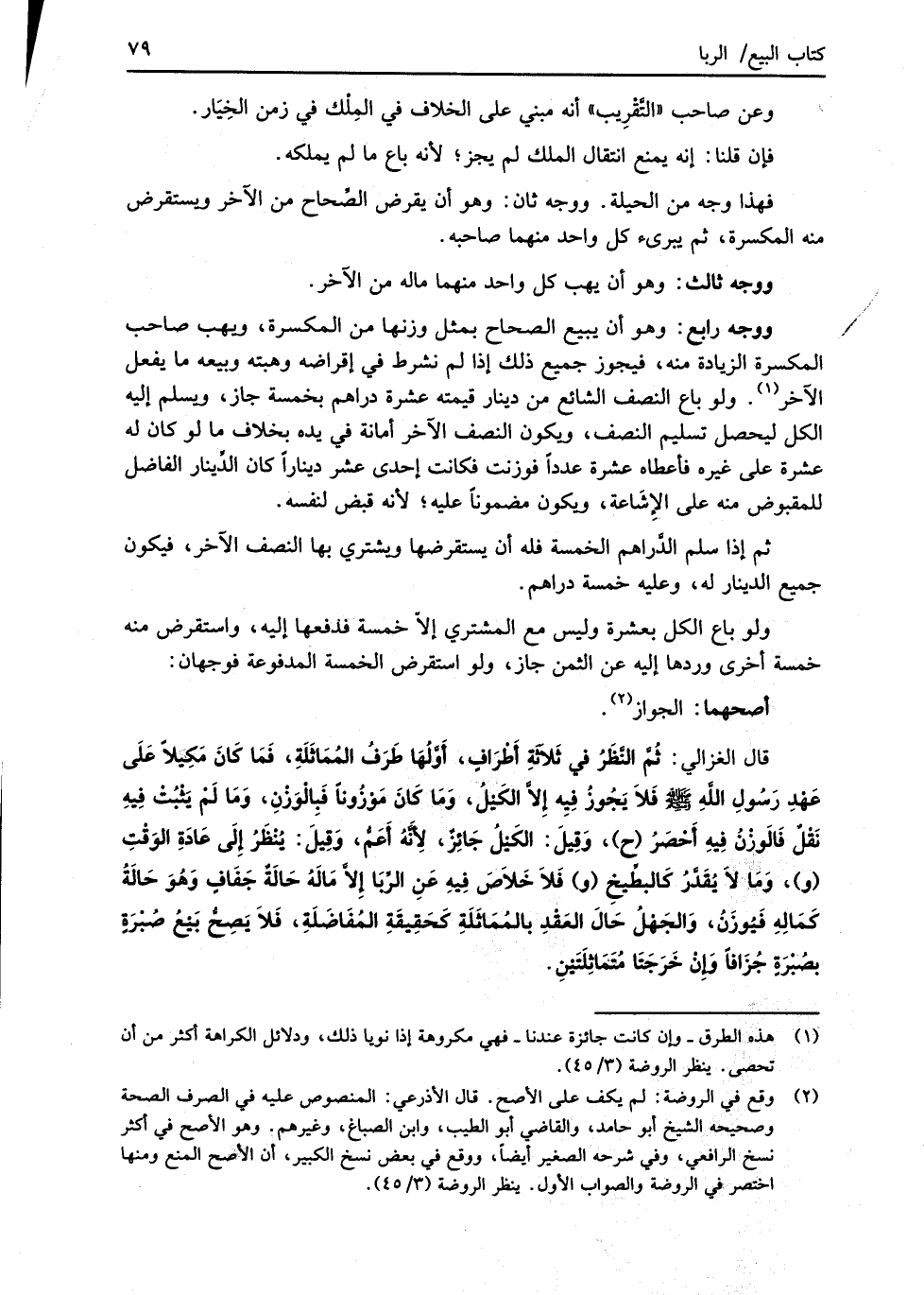 قال الغزالي: ثُمَّ النَّظَرُ في ثَلاَثةِ أَطْرَافٍ، أَوَّلُهَا طَرَفُ المُمَاثَلَةِ، فَمَا كانَ مَكِيلاً عَلَى عَهْدِ رَسُولِ اللهِ -صلى الله عليه وسلم- فَلاَ يَجُوزُ فِيِه إِلاَّ الكَيْلُ، وَمَا كَانَ مَوْزُوناَ فَبِالْوَزْنِ، وَمَا لَمْ يَثْبُتْ فِيهِ نَقْلٌ فَالَوزْنُ فِيهِ أَحْصَرُ (ح)، وَقِيلَ: الكَيْلُ جَائِزٌ، لِأَنَّهُ أَعَمُّ، وَقِيلَ: يُنْظَرُ إِلَى عَادَةِ الوَقْتِ (و)، وَمَا لا يُقَدَّرُ كَالبطِّيخِ (و) فَلاَ خَلاَصَ فِيهِ عَنِ الرِّبَا إلاَّ مَالَهُ حَالَةٌ جَفَافٍ وَهُوَ حَالَةُ كمَالِهِ فَيُوزَنُ، وَالجَهلُ حَالَ العَقدِ بالممَاثلَةِ كَحَقِيقَةِ المُفَاضَلَةِ، فَلاَ يَصِحُّ بَيْعُ صُبْرَةِ بصُبْرَة جُزَافاً وَإِنْ خَرَجَتَا مُتَمَاثِلَتَيْنِ.