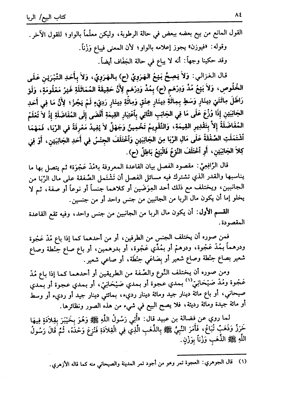 قال الرَّافِعِيّ: مقصود الفصل بيان القاعدة المعروفة بـ "مُدّ عَجْوَة" ثم يتصل بها ما يناسبها والقدر الذي تشترك فيه مسائل الفصل أن تَشْتَمل الصَّفقة على مال الرِّبَا من الجانبين، ويختلف مع ذلك أحد العِوَضَين أو كلاهما جنساً أو نوعاً أو صفة، ثم لا يخلو إما أن يكون مال الربا من الجانبين من جنس واحد أو من جنسين.