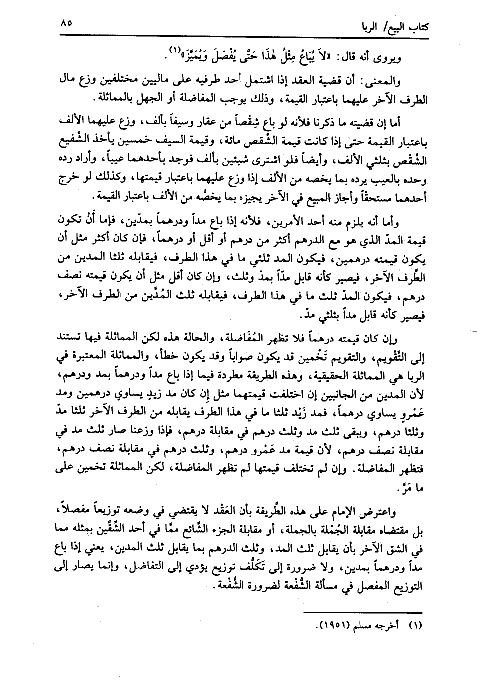 وإن كان قيمته درهماً فلا تظهر المُفَاضلة، والحالة هذه لكن المماثلة فيها تستند إلى التَّقْويم، والتقويم تَخْمين قد يكون صواباً وقد يكون خطأ، والمماثلة المعتبرة في الربا هي المماثلة الحقيقية، وهذه الطريقة مطردة فيما إذا باع مداً ودرهماً بمد ودرهم، لأن المدين من الجانبين إن اختلفت قيمتهما مثل إِن كان مد زيدٍ يساوي درهمين ومد عَمْروٍ يساوي درهماً، فمد زَيْد ثلثا ما في هذا الطرف يقابله من الطرف الآخر ثلثا مدّ وثلثا درهم، ويبقى ثلث مد وثلث درهم في مقابلة درهم، فإذا وزعنا صار ثلث مد في مقابلة نصف درهم، لأن قيمة مد عَمْرو درهم، وثلث درهم في مقابلة نصف درهم، فتظهر المفاضلة. وإن لم تختلف قيمتها لم تظهر المفاضلة، لكن المماثلة تخمين على ما مَرَّ.