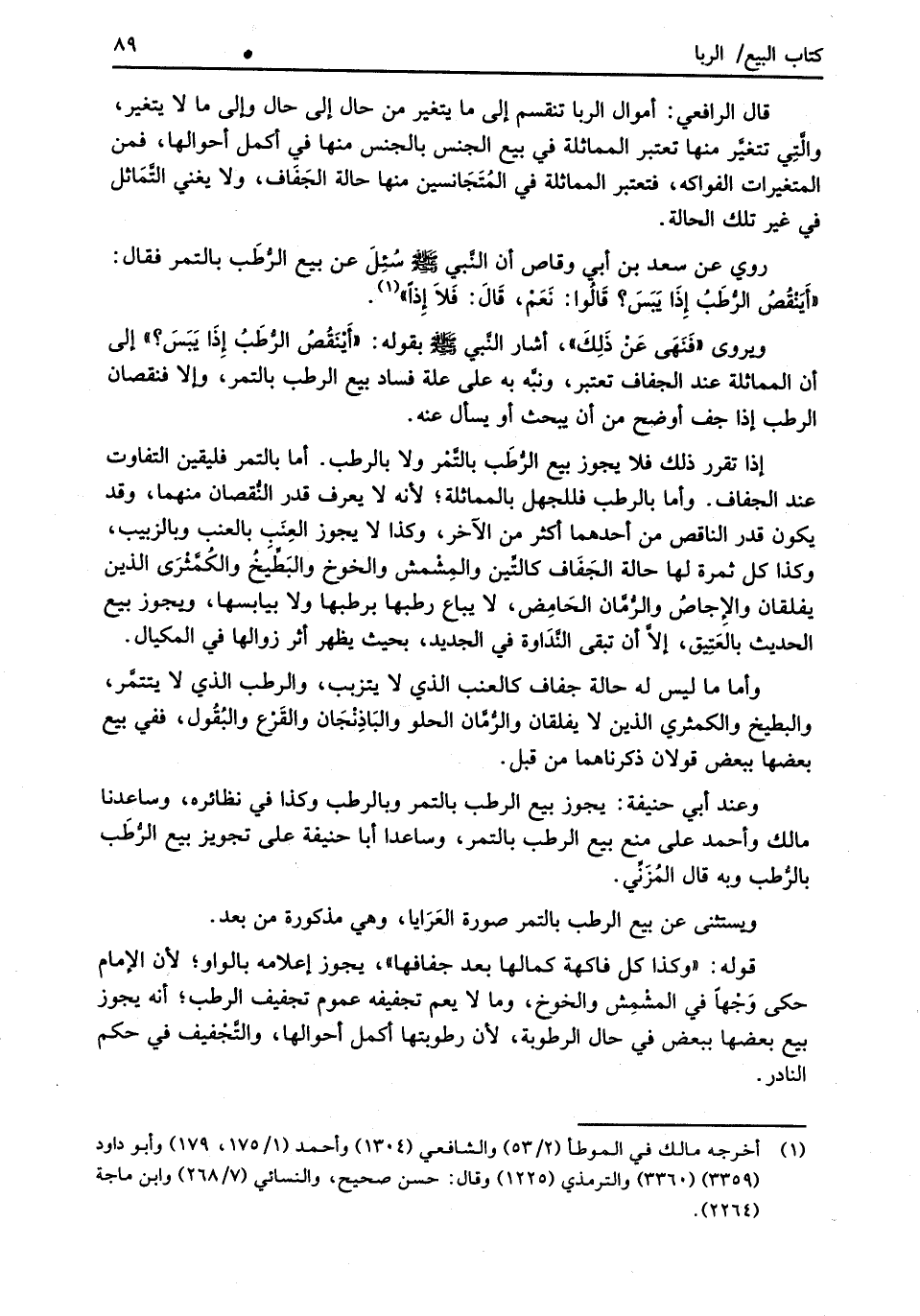 روي عن سعد بن أبي وقاص أن النَّبي -صلى الله عليه وسلم- سُئِلَ عن بيع الرُّطَب بالتمر فقال: "أَيَنقُصُ الرُّطَبُ إذَا يَبَسَ؟ قَالُوا: نَعَمْ، قَالَ: فَلاَ إِذاً" (¬1).