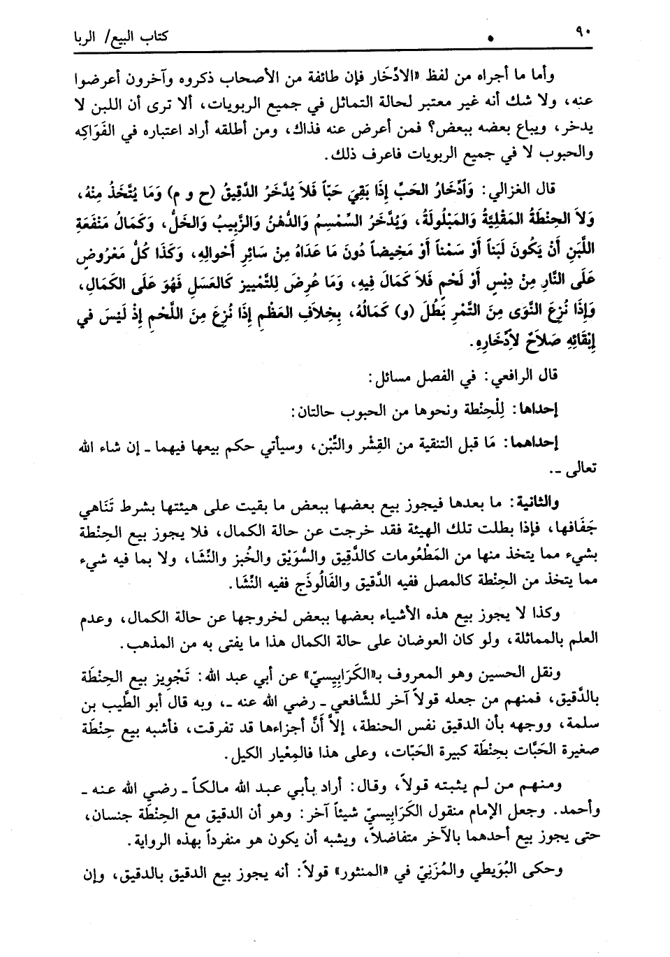 قال الغزالي: وَادِّخَارُ الحَبِّ إِذَا بَقِيَ حَبًّا فَلاَ يُدَّخَرُ الدَّقِيقُ (ح وم) وَمَا يُتَّخَذُ مِنْهُ، وَلاَ الحِنْطَةُ المَقْلِيَّةُ وَالمَبْلُولَةُ، وَيُدَّخَرُ السَّمْسِمُ وَالدُّهْنُ وَالزَّبِيبُ وَالخَلُّ، وَكَمَالُ مَنْفَعَةِ اللَّبَنِ أَنْ يَكُونَ لَبَناً أَوْ سَمْناً أَوْ مَخِيضاً دُونَ مَا عَدَاهُ مِنْ سَائِرِ أَحْوالِهِ، وَكَذَا كُلُّ مَعْرُوضٍ علَى النَّارِ مِنْ دبْسِ أَوْ لَحْمِ فَلاَ كَمَالَ فِيهِ، وَمَا عُرِضَ لِلتَّمْييز كَالعَسَلِ فَهُوَ علَى الكَمَالِ، وَإذَا نُزِعَ النَّوَى مِنَ التَّمْرِ بَطُلَ (و) كَمَالُهُ، بِخِلاَفِ العَظْمِ إِذَا نُزِعَ مِنَ اللَّحْمِ إِذْ لَيْسَ في إِبْقَائِهِ صَلاحٌ لاِدْخَارِهِ.