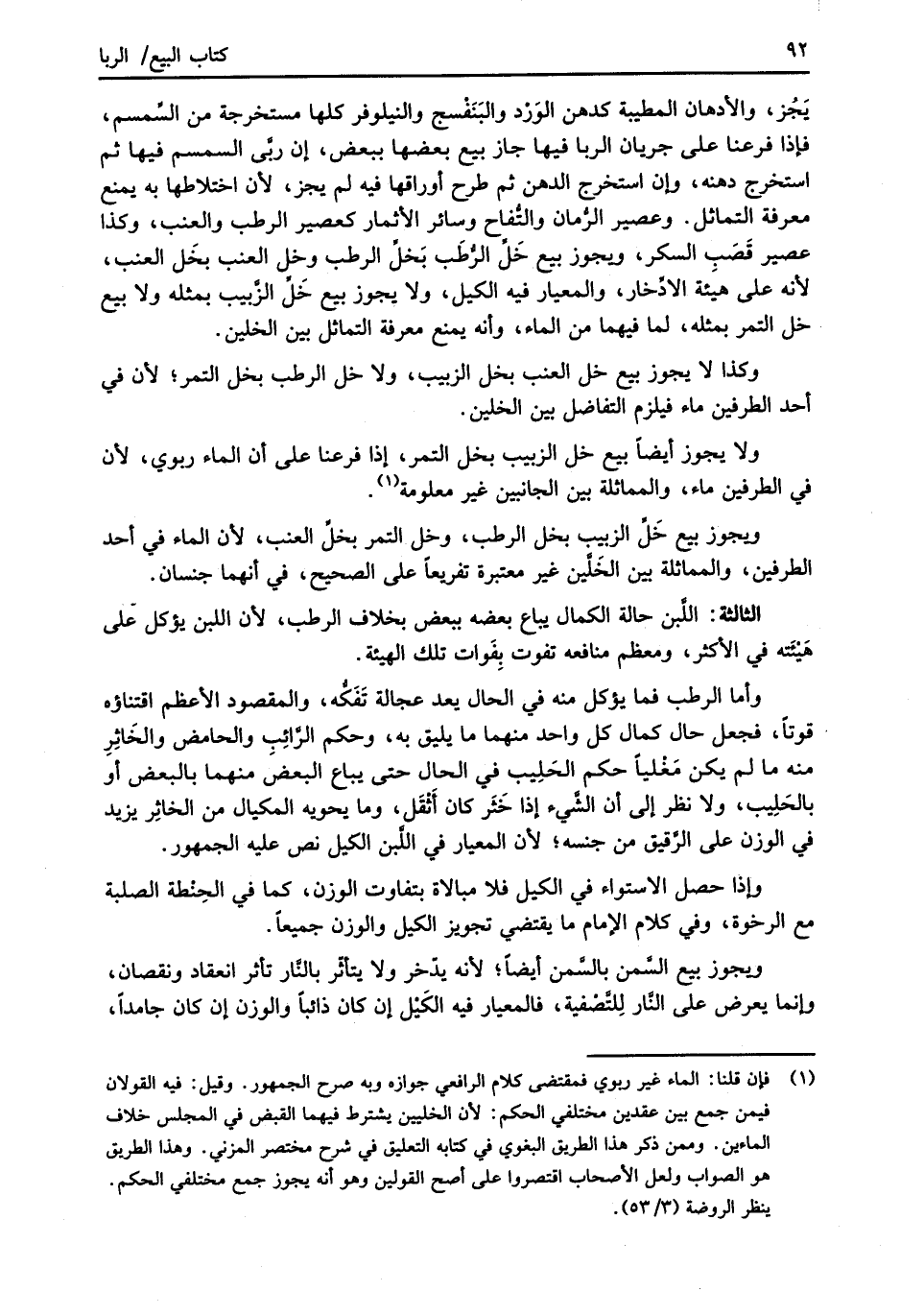 يَجُز، والأدهان المطيبة كدهن الوَرْد والبَنَفْسج والنيلوفر كلها مستخرجة من السِّمسم، فإذا فرعنا على جريان الربا فيها جاز بيع بعضها ببعض، إن ربَّى السمسم فيها ثم استخرج دهنه، وإن استخرج الدهن ثم طرح أوراقها فيه لم يجز، لأن اختلاطها به يمنع معرفة التماثل. وعصير الرُّمان والتُّفاح وسائر الأثمار كعصير الرطب والعنب، وكذا عصير قَصَبِ السكر، ويجوز بيع خَلِّ الرُّطَب بَخلِّ الرطب وخل العنب بخَل العنب، لأنه على هيئة الادِّخار، والمعيار فيه الكيل، ولا يجوز بيع خَلِّ الزَّبيب بمثله ولا بيع خل التمر بمثله، لما فيهما من الماء، وأنه يمنع معرفة التماثل بين الخلين.