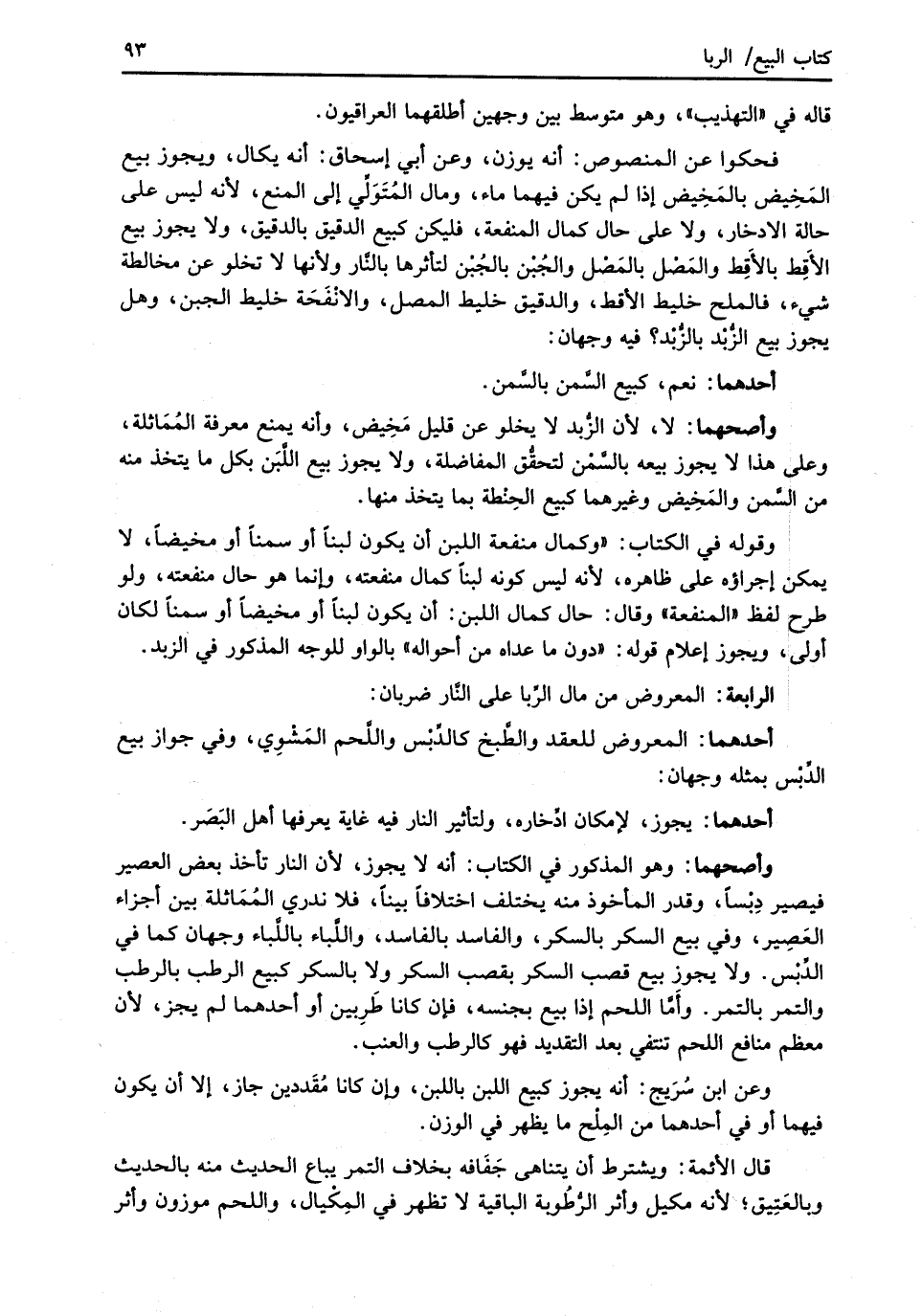 وأصحهما: وهو المذكور في الكتاب: أنه لا يجوز، لأن النار تأخذ بعض العصير فيصير دِبْساً، وقدر المأخوذ منه يختلف اختلافاً بيناً، فلا ندري المُمَاثلة بين أجزاء العَصِير، وفي بيع السكر بالسكر، والفاسد بالفاسد، واللَّباء باللَّباء وجهان كما في الدِّبْس. ولا يجوز بيع قصب السكر بقصب السكر ولا بالسكر كبيع الرطب بالرطب والتمر بالتمر. وأَمَّا اللحم إذا بيع بجنسه، فإن كانا طَرِبين أو أحدهما لم يجز، لأن معظم منافع اللحم تنتفي بعد التقديد فهو كالرطب والعنب.