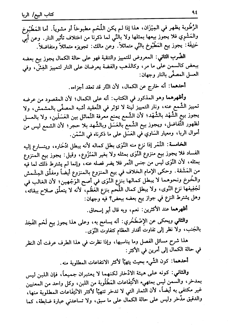 الرُّطُوبة يظهر في المِيْزَان، هذا إذا لم يكن اللَّحْم مطبوخاً أو مشوياً. أما المَطْبُوخ والمَشْوِي فلا يجوز بيعها بمثلها ولا بالنَّي لما ذكرنا من اختلاف تأثير النار. وعن أَبِي حَنيفَة: يجوز بيع المَطْبُوخ بالنَّي متماثلاً. وعن مالك: تجويزه متماثلاً ومتفاضلاً.