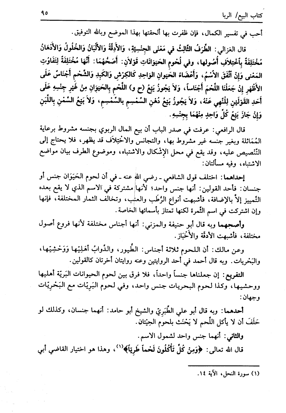 قال الغزالي: الطَّرَفُ الثَّالِثُ في مَعْنَى الجِنْسِيَّةِ، وَالأَدِقَّةُ وَالأَلْبَانُ وَالخُلُولُ وَالأَدْهَانُ مُخْتَلِفَةٌ بِاخْتِلاَفِ أُصُولها، وفي لُحْومِ الحَيَوَانَاتِ قَوْلاَنِ: أَصَحُّهُمَا: أَنَّهَا مُخْتَلِفَةٌ لِتَفَاوُتِ المَعْنى وَإِنْ اتَّفَقَ الاسْمُ، وَأَعْضَاءُ الحَيَوانِ الوَاحِدِ كَالكِرْشِ وَالكَبِدِ وَالشَّحْمِ أَجْنَاسٌ عَلَى الأَظْهَرِ إِنْ جَعَلْنَا اللَّحْمَ أَجْنَاساً، وَلاَ يَجُوزُ بَيْعُ (ح و) اللَّحْمِ بِالحَيَوَانِ مِنْ غَيْرِ جِنْسِهِ علَى أَحَدِ القَوْلَيْنِ لِلْنَّهِي عَنْهُ، وَلاَ يَجُوزُ بَيْعُ دُهْنِ السِّمْسِمِ بالسِّمْسِمِ، وَلاَ بَيْعُ السَّمْنِ بِاللَّبَنِ وَإِنْ جَازَ بَيْعُ كُلِّ وَاحِدٍ مِنْهُمَا بِجِنْسِهِ.