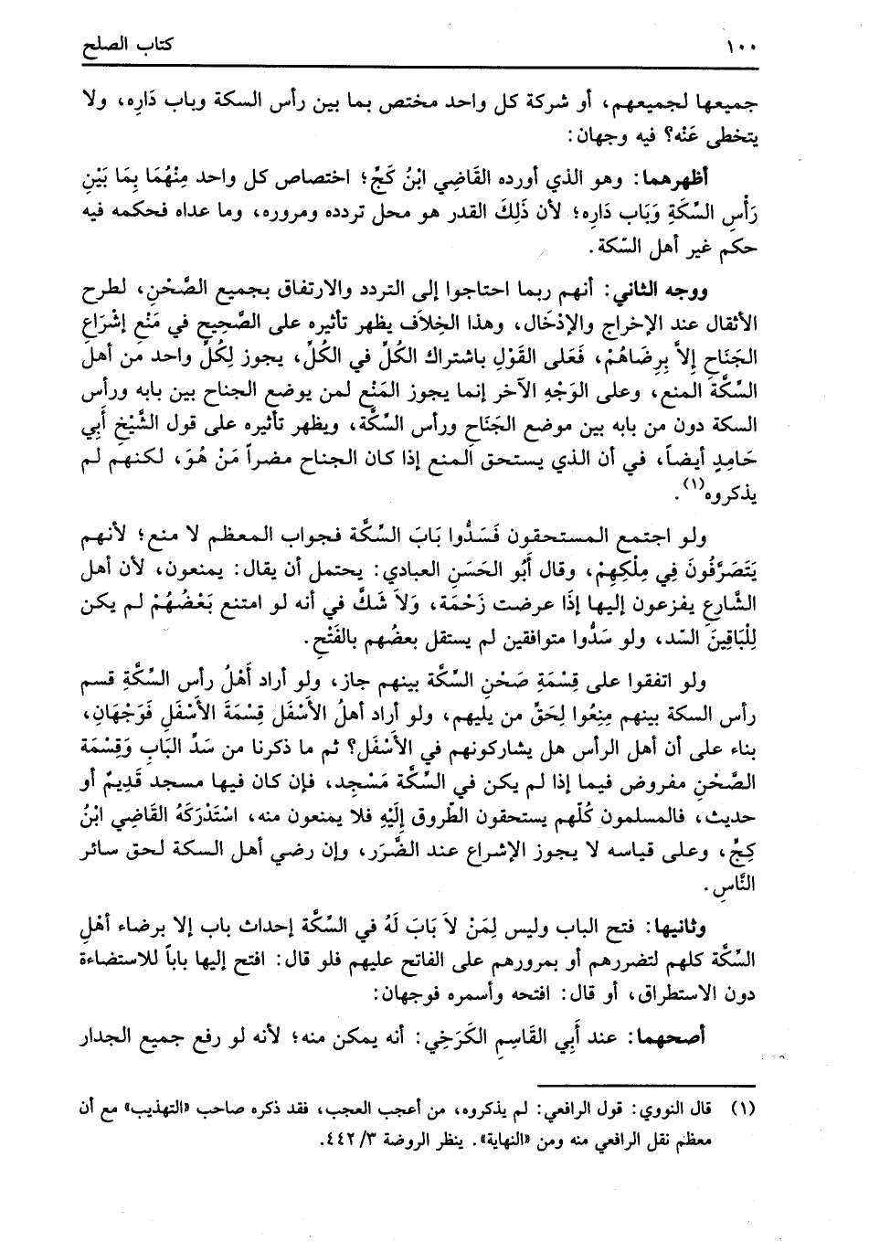 ووجه الثاني: أنهم ربما احتاجوا إلى التردد والارتفاق بجميع الصَّحْنِ، لطرح الأثقال عند الإخراج والإدْخَال، وهذا الخِلاَف يظهر تأثيره على الصَّحِيح في مَنْع إشْرَاعِ الجَنَاح إِلاَّ بِرِضَاهُمْ، فَعَلى القَوْلِ باشتراك الكُلِّ في الكُلِّ، يجوز لِكُلِّ واحد من أهل السِّكَّة المنع، وعلى الوَجْهِ الآخر إنما يجوز المَنْع لمن يوضع الجناح بين بابه ورأس السكة دون من بابه بين موضع الجَنَاحِ ورأس السِّكَّة، ويظهر تأثيره على قول الشَّيْخ أَبِي حامِدٍ أيضًا، في أن الذي يستحق المنع إذا كان الجناح مضرًا مَنْ هُوَ، لكنهم لم يذكروه (¬1).