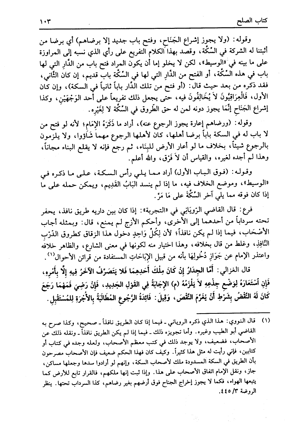 وقوله: (ولا يجوز إشراع الجَنَاحِ، وفتح باب جديد إلا برضاهم) أي برضا من أثبتنا له الشركة في السِّكَّة، وقصد بهذا الكلام التفريع على رأي الذي نسبه إلى المراوزة على ما بينه في "الوسيط"، لكن لا يخلو إما أن يكون المراد فتح باب من الدَّارِ التي لها باب في هذه السِّكَّة، أو الفتح من الدَّارِ التي لها في السِّكَّة باب قديم، إن كان الثَّاني، فقد ذكره من بعد حيث قال: (أو فتح من تلك الدَّار بابًا ثانيًا في السِّكَّة)، وإن كان الأوّل، فَالْعِرَاقِيُّونَ لا يُخالِفُونَ فيه، حتى يجعل ذلك تفريعًا على أحد الوَجْهَيْنِ، وكذا إشراع الجَناحِ إِنَّمَا يجوز دونه لمن له حق الطّروق في السِّكَّة لا لِغَيْرِه.