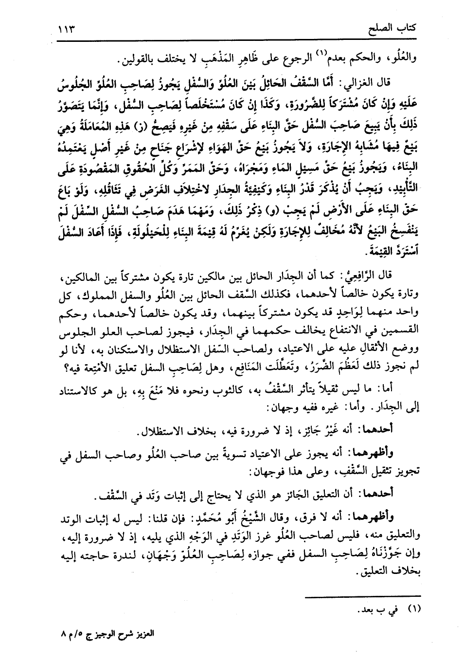 قال الغزالي: أَمَّا السَّقْفُ الحائِلُ بَيْنَ العُلُوِّ والسُّفْلِ يَجُوزُ لِصَاحِبِ العُلُوِّ الجُلُوسُ عَلَيْهِ وَإِنْ كَانَ مُشْتَرَكًا لِلضَّرُورَةِ، وَكَذا إِنْ كَانَ مُسْتَخْلَصًا لِصَاحِبِ السُّفْل، وَإِنَّمَا يَتَصَوَّرُ ذَلِكَ بأَنْ يَبِيعَ صَاحِبَ السُّفْل حَقَّ البِنَاءِ عَلَى سَقْفِهِ مِنْ غَيْرِهِ فَيَصِحُّ (ز) هَذِهِ المُعامَلَةُ وَهِيَ بَيْعٌ فِيهَا مُشَابِهُ الإِجارَةِ، وَلا يَجُوزُ بَيْعُ حَقِّ الهَوَاءِ لإشْرَاعِ جَنَاحٍ مِنْ غَيْرِ أَصْلٍ يَعْتَمِدُهُ البِنَاءُ، وَيَجُوزُ بَيْعُ حَقِّ مَسِيْل المَاءِ وَمَجْرَاهُ، وَحَقِّ المَمَرِّ وَكُلِّ الحُقُوقِ المَقْصُودَةِ عَلَى التَّأْبِيدِ، وَيَجِبُ أن يُذْكَرَ قَدْرُ البِنَاءِ وَكَيْفِيَّةُ الجِدَارِ لاخْتِلاَفِ الغَرَضِ في تَثَاقُلِهِ، وَلَوْ بَاعَ حَقّ البِنَاءِ عَلَى الأَرْضِ لَمْ يَجِبْ (و) ذِكْرُ ذَلِكَ، وَمَهْمَا هَدَمَ صاحِبُ السُّفْلِ السِّفْلَ لَمْ يَنْفَسِخُ البَيْعُ لأنَّهُ مُخَالِفٌ لِلإِجَارَةِ وَلَكِنْ يُغَرِّمُ لَهُ قِيْمَةَ البِنَاءِ لِلْحَيلُولَةِ، فَإذَا أَعَادَ السُّفْلَ اسْتَرَدَّ القِيْمَةَ.