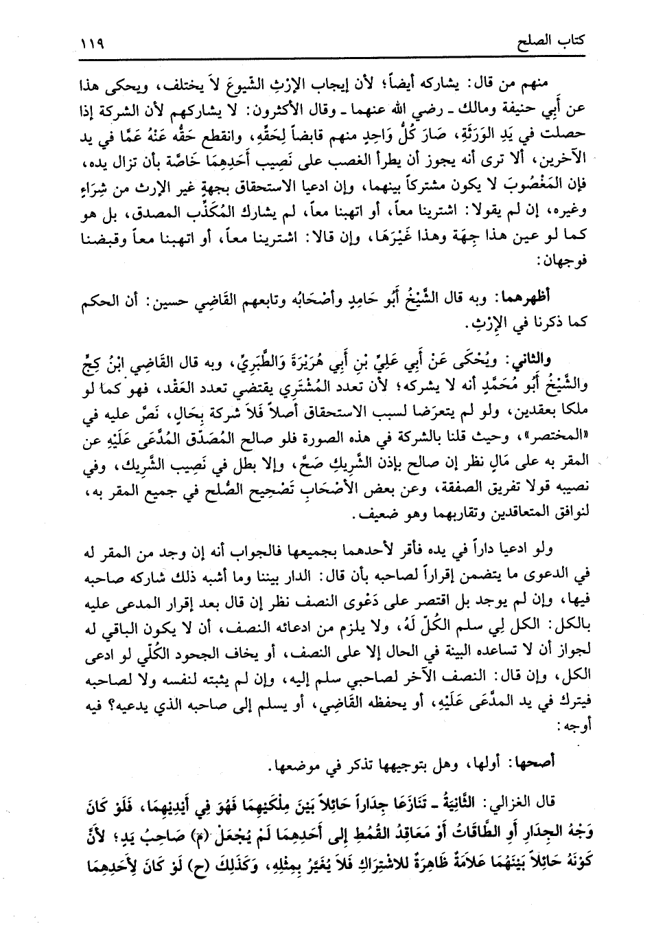 والثاني: ويُحْكَى عَنْ أَبِي عَلِيِّ بْنِ أَبِي هُرَيْرَةَ وَالطَّبَرِيِّ، وبه قال القَاضِي ابْنُ كِجٍّ والشَّيْخُ أَبُو مُحَمَّدٍ أنه لا يشركه؛ لأن تعدد المُشْتَرِي يقتضي تعدد العَقْد، فهو كما لو ملكا بعقدين، ولو لم يتعرَضا لسبب الاستحقاق أصلاً فَلاَ شركة بِحَالٍ، نَصَّ عليه في "المختصر"، وحيث قلنا بالشركة في هذه الصورة فلو صالح المُصَدّق المُدَّعَى عَلَيْهِ عن المقر به على مَالٍ نظر إن صالح بإذن الشَّرِيكِ صَحَّ، وإلا بطل في نَصِيب الشَّرِيك، وفي نصيبه قولا تفريق الصفقة، وعن بعض الأصْحَابِ تَصْحِيح الصُّلح في جميع المقر به، لنوافق المتعاقدين وتقاربهما وهو ضعيف.