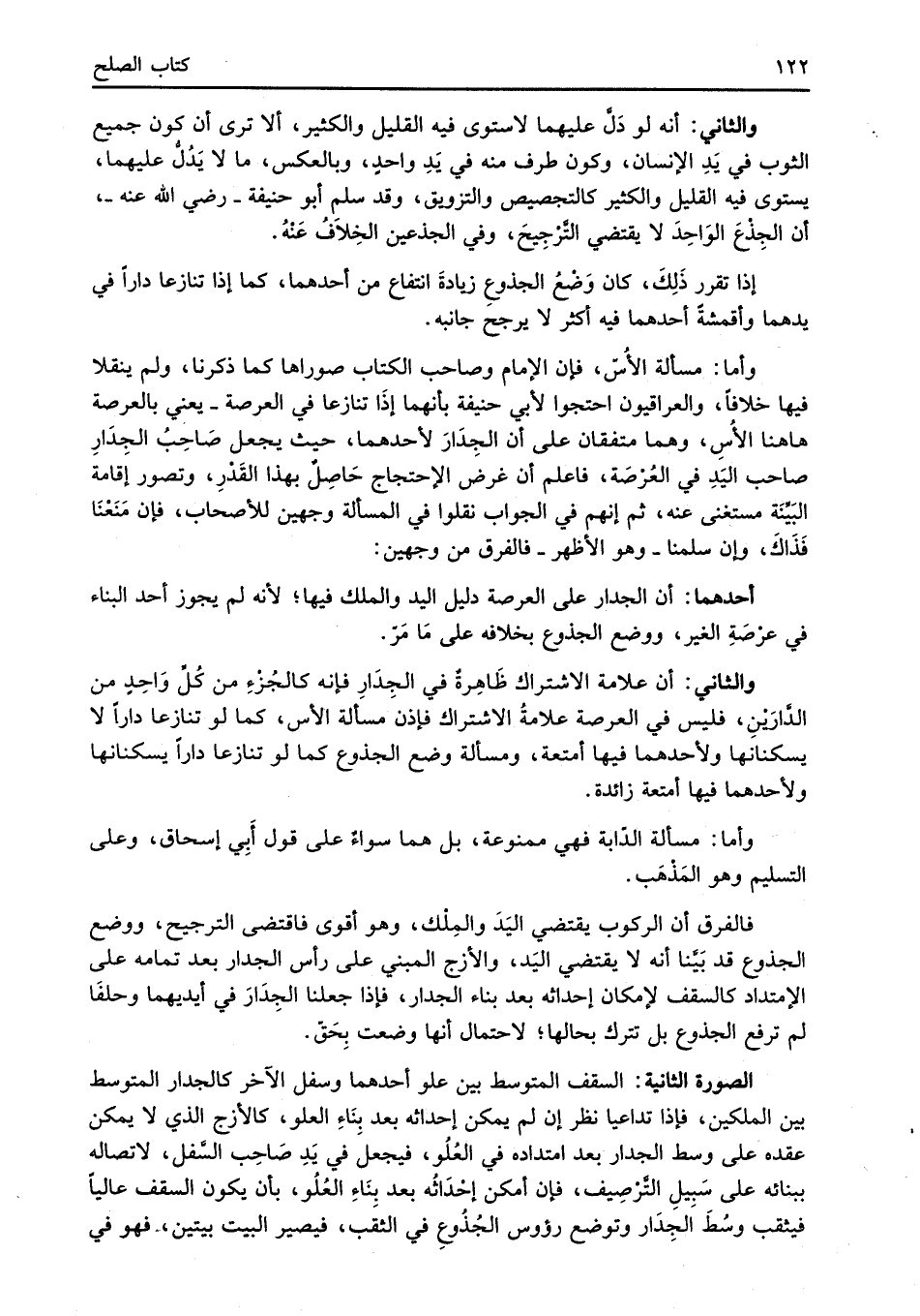 الصورة الثانية: السقف المتوسط بين علو أحدهما وسفل الآخر كالجدار المتوسط بين الملكين، فإذا تداعيا نظر إن لم يمكن إحداثه بعد بِنَاءِ العلو، كالأزج الذي لا يمكن عقده على وسط الجدار بعد امتداده في العُلُو، فيجعل في يَدِ صَاحِب السَّفل، لاتصاله ببنائه على سَبِيلِ التَّرْصِيف، فإن أمكن إحْدَاثُه بعد بِنَاءِ العُلُو، بأن يكون السقف عالياً فيثقب وسُطَ الجِدَار وتوضع رؤوس الجُذُوعِ في الثقب، فيصير البيت بيتين، فهو في
