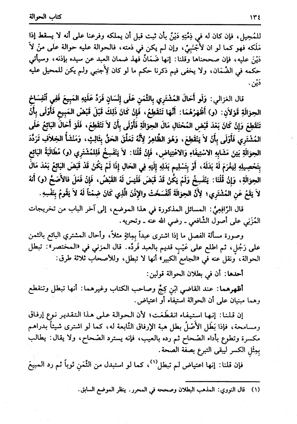 قال الغزالي: وَلَو أَحَالَ المُشْتَرِي بِالثَّمَنِ عَلَى إنْسَانٍ فَرَدَّ عَلَيْهِ المَبِيعَ فَفِي انْفِسَاخِ الحِوَالَةِ قَوْلاَنِ: (و) أَظْهَرُهُمَا: أَنَّهَا تَنْقَطِعُ، فَإنْ كَانَ ذَلِكَ قَبْلَ قَبْضْ المَبِيعِ فَأَوْلَى بِأَنْ تَنْقَطِعَ وَإِنْ كَانَ بَعْدَ قَبْضِ المُحْتَالِ مَالَ الحِوَالَةِ فَأَوْلَى بِأَنْ لاَ تَنْقَطِعَ، فَلَوْ أَحَالَ البَائِعُ عَلَى المُشْتَرِي فَأَوْلَى بِأَنْ لاَ يَنْقَطِعَ، وَهُوَ الظَّاهِرُ لِأَنَّهُ تَعَلَّقَ الحَقُّ بِثَالِثٍ، وَمَنْشَأُ الخِلاَفِ تَرَدُّدَ الحِوَالَةِ بَيْنَ مَشَابِهِ الاسْتِيفَاءِ وَالاعْتِيَاضِ، فَإِنْ قُلْنَا: لاَ ينْفَسِخُ فَلِلمُشْتَرِي (و) مُطَالَبَةُ البَائِعِ بِتَحْصِيلِهِ لِيَغْرَمَ لَهُ بَدَلَهُ، أَوْ بِتَسْلِيم بَدَلِهِ إِلَيْهِ فِي الحَالِ إِذَا لَمْ يَكُنْ قَدْ قَبَضَ البَائِعُ بَعْدَ مَالَ الحِوَالَةِ، وَإِنْ قُلْنَا: يَنْفَسِخُ وَلَمْ يَكُنْ قَدْ قَبَضَ فَلَيْسَ لَهُ القَبْضُ، فَإِنْ فَعَلَ فالأَصَحُّ (و) أَنهُ لاَ يَقَعُ عَنِ المُشْتَرِي؛ لِأَنَّ الحِوَالَةَ انْفَسَخَتْ والإِذْنَ الَّذِي كَانَ ضِمْناً لَهُ لاَ يَقُومُ بِنَفْسِهِ.