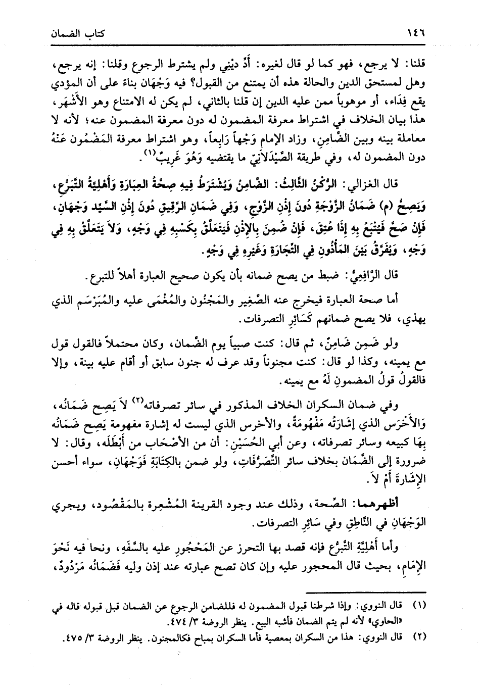 قال الغزالي: الرُّكْنُ الثَّالِثُ: الضَّامِنُ وُيشْتَرَطُ فِيهِ صِحَّةُ العِبَارَةِ وَأَهْلِيَّةُ التَّبرُّعِ، وَيَصِحُّ (م) ضَمَانُ الزَّوْجَةِ دُونَ إِذْنِ الزَّوجِ، وَفي ضَمَانِ الرَّقِيقِ دُونَ إِذْنِ السَّيِّد وَجْهَانِ، فَإِنْ صَحَّ فَيُتْبَعُ بِهِ إِذَا عُتِقَ، فَإِنْ ضُمِنَ بِالأِذْنِ فَيَتَعَلَّقُ بِكَسْبِهِ فِي وَجْهٍ، وَلاَ يَتَعَلَّقُ بِهِ في وَجْهٍ، وَيُفَرَّقُ بَيْنَ المَأْذُونِ فِي التِّجَارَةِ وَغَيْرِهِ في وَجْهٍ.