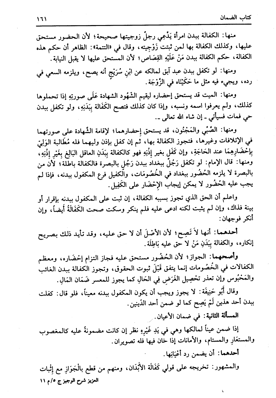 ومنها: الصَّبِّي والمَجْنُون، قد يستحق إِحضارهما؟ لإقامة الشَّهادة على صورتهما في الإتلافات وغيرها، فتجوز الكفالة بها، ثم إن كفل بإذن وليهما فله مُطَالبة الوَلِيّ بِإحْضَارِهِمَا عند الحَاجَةِ، وإن كَفَل بغير إِذْنِهِ فهو كالكفالة بِبَدَنِ العاقل البَالِغ بِغَيْرِ إِذْنِهِ، ومنها: قال الإمام: لو تكفل رَجُلٌ ببغداد ببدن رَجُلٍ بالبصرة فالكفالة باطلة؛ لأن من بالبصرة لا يلزمه الحُضُور ببغداد في الخُصُومَات، والكفيل فرع المكفول ببدنه، فإذا لم يجب عليه الحُضُور لا يمكن إيجاب الإِحْضَار على الكَفِيل.