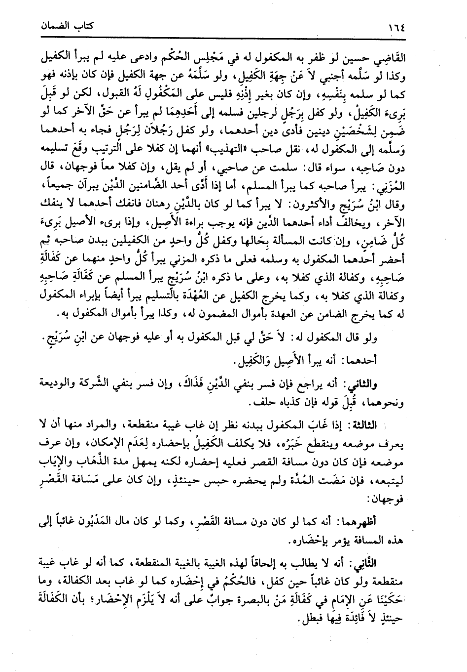 القَاضِي حسين لو ظفر به المكفول له في مَجْلِس الحُكْم وادعى عليه لم يبرأ الكفيل وكذا لو سَلَّمه أجنبي لاَ عَنْ جِهَةِ الكَفِيلِ، ولو سَلَّمَهُ عن جهة الكفيل فإن كان بإذنه فهو كما لو سلمه بِنَفْسِهِ، وإن كان بغير إِذْنِهِ فليس على المَكْفُولِ لَهُ القبول، لكن لو قَبِلَ بَرِئَ الكَفِيلُ، ولو كفل برَجُلٍ لرجلين فسلمه إلى أَحَدِهِمَا لم يبرأ عن حَقِّ الآخر كما لو ضَمِن لِشَخْصَيْنِ دينين فأدى دين أحدهما, ولو كفل رَجُلاَن لِرَجُلٍ فجاء به أحدهما وَسلَّمه إلى المكفول له، نقل صاحب "التهذيب" أنهما إن كفلا على الترتيب وقَعَ تسليمه دون صَاحِبه، سواء قال: سلمت عن صاحبي، أو لم يقل، وإن كفلا معاً فوجهان، قال المُزَنِي: يبرأ صاحبه كما يبرأ المسلم، أما إذا أَدَّى أحد الضَّامنين الدَّيْن يبرآن جميعاً، وقال ابْنُ سُرَيْجٍ والأكثرون: لا يبرأ كما لو كان بالدَّيْنِ رهنان فانفك أحدهما لا ينفك الآخر، ويخالف أداء أحدهما الدَّين فإنه يوجب براءة الأَصِيل، وإذا برئ الأصيل بَرِئَ كُلُّ ضَامِنٍ، وإن كانت المسألة بِحَالها وكفل كُلُّ واحدٍ من الكفيلين ببدن صاحبه ثم أحضر أحدهما المكفول به وسلمه فعلى ما ذكره المزني يبرأ كُلُّ واحدٍ منهما عن كَفَالَةِ صَاحِبِهِ، وكفالله الذي كفلا به، وعلى ما ذكره ابْنُ سُرَيْجٍ يبرأ المسلم عن كَفَالَةِ صَاحِبهِ وكفالة الذي كفلا به، وكما يخرج الكفيل عن العُهْدَة بالتسليم يبرأ أيضاً بإبراء المكفولَ له كما يخرج الضامن عن العهدة بأموال المضمون له، وكذا يبرأ بأموال المكفول به.