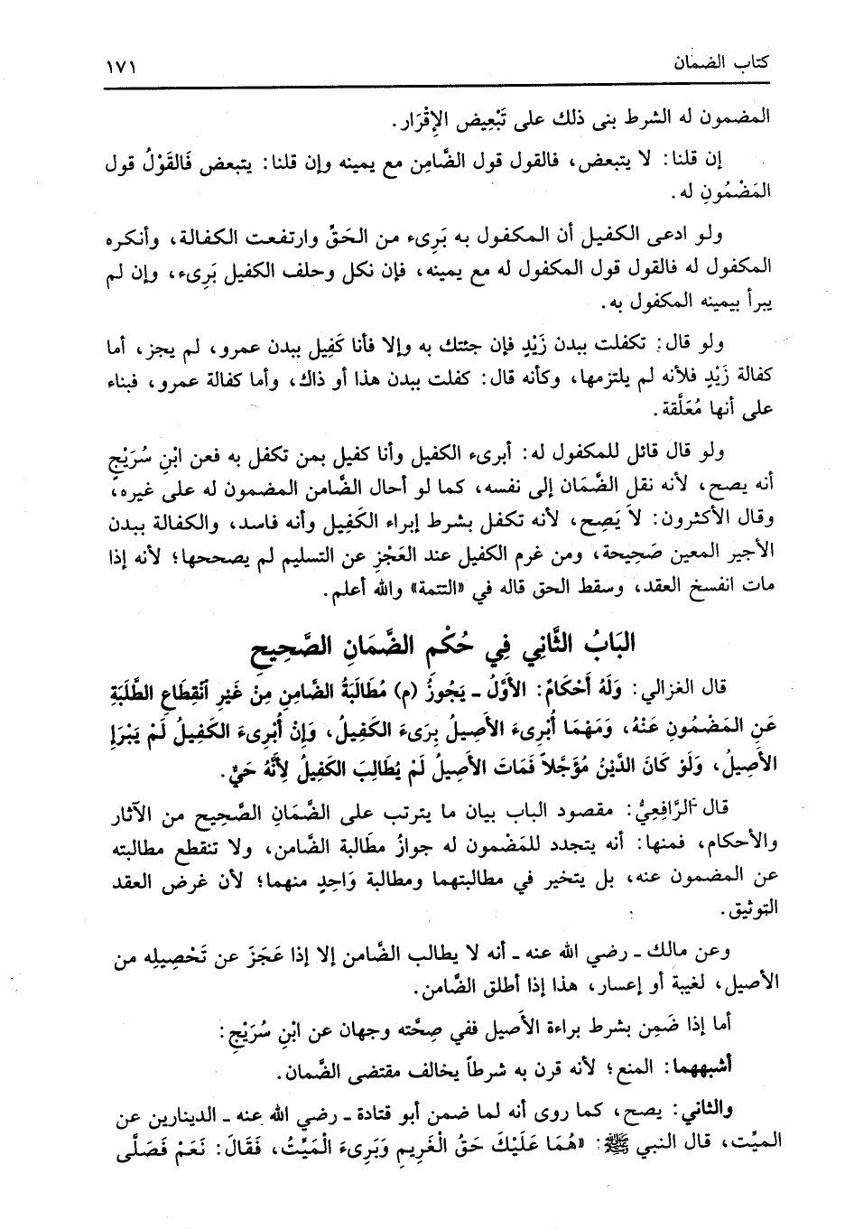قال الغزالي: وَلَهُ أَحْكَامٌ: الأَوَّلُ -يَجُوزُ (م) مُطَالَبَةُ الضَّامِنِ مِنْ غَيْرِ انْقِطَاعِ الطَّلَبَةِ عَنِ المَضْمُونِ عَنْهُ، وَمَهْمَا أُبْرِئَ الأَصِيلُ بِرَئَ الكَفِيلُ، وَإِنْ أُبْرِئَ الكَفِيلُ لَمْ يَبْرَإِ الأَصِيلُ، وَلَوْ كَانَ الدَّيْنُ مُؤَجَّلاً فَمَاتَ الأَصِيلُ لَمْ يُطَالِبَ الكَفِيلُ لِأَنَّهُ حَيٌّ.