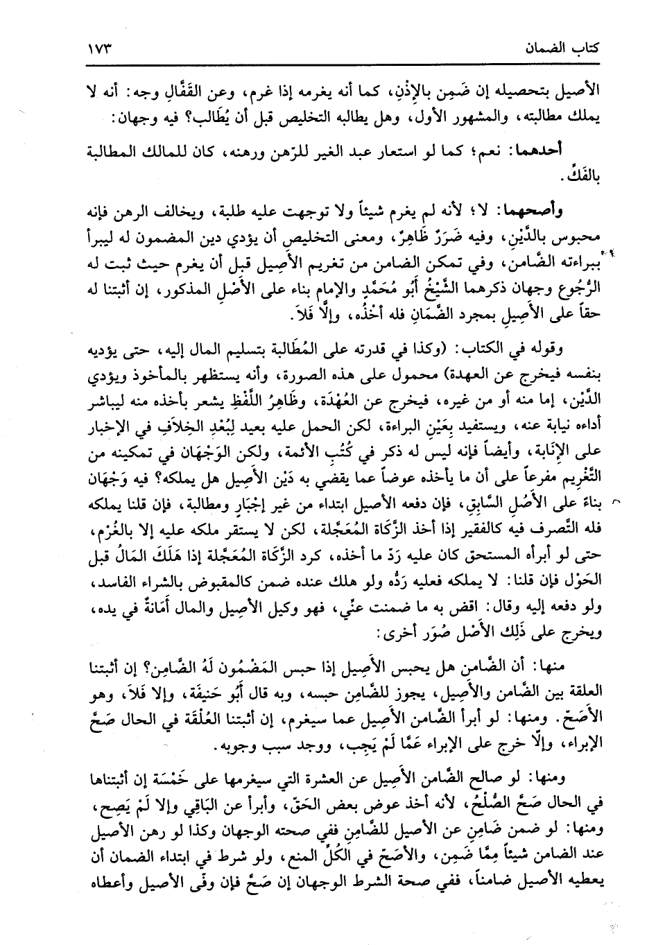 ومنها: لو صالح الضَّامن الأَصِيل عن العشرة التي سيغرمها على خَمْسَة إن أثبتناها في الحال صَحَّ الصُّلْحُ, لأنه أخذ عوض بعض الحَقّ، وأبرأ عن البَاقِي وإلا لَمْ يَصِح، ومنها: لو ضمن ضَامِنِ عن الأصيل للضَّامِنِ ففي صحته الوجهان وكذا لو رهن الأصيل عند الضامن شيئاً مِمَّا ضَمِن، والأصَحّ في الكُلِّ المنع، ولو شرط في ابتداء الضمان أن يعطيه الأصيل ضامناً، ففي صحة الشرط الوجهان إن صَحَّ فإن وفّى الأصيل وأعطاه